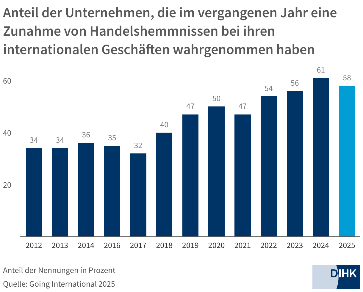 Anteil der Unternehmen, die im vergangenen Jahr eine Zunahme von Handelshemmnissen bei ihren internationalen Geschäften wahrgenommen haben