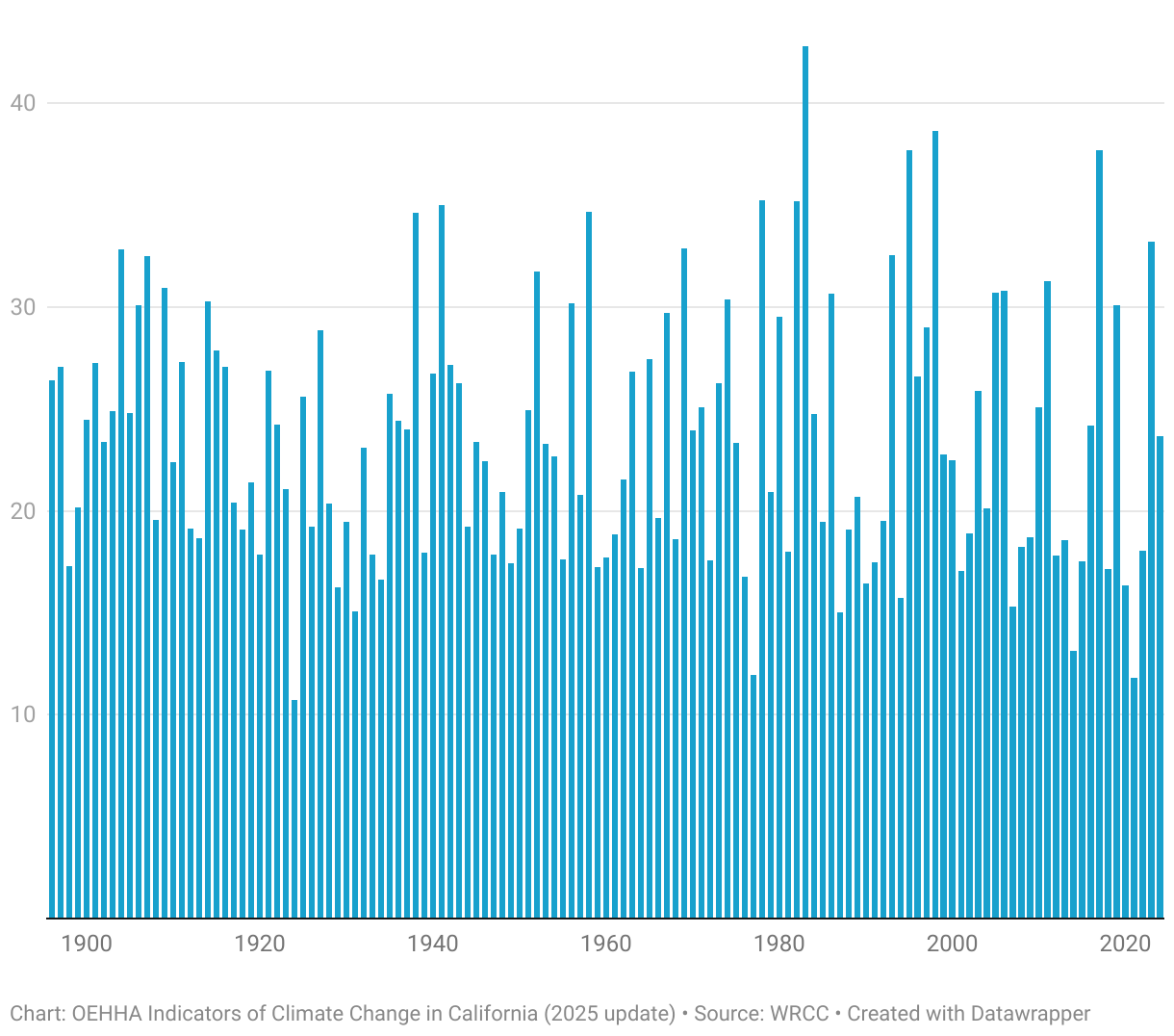 This bar graph shows precipitation totals from 1896 to 2024 tracked by water year, from the beginning of the rainy season in October through the following September, the end of the dry season. California experiences high year-to-year variability, with greater variability in recent years.