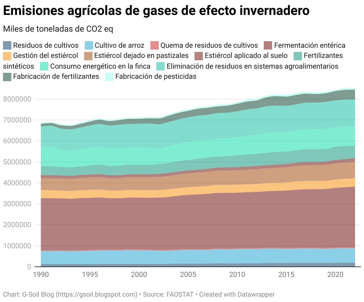 Gráfico de áreas apiladas titulado "Emisiones agrícolas de gases de efecto invernadero", que muestra la evolución de las emisiones en miles de toneladas de CO₂ equivalente desde 1990 hasta 2021. Cada banda de color representa una fuente distinta de emisiones agrícolas, incluyendo residuos de cultivos, cultivo de arroz, quema de residuos, fermentación entérica, gestión del estiércol, estiércol en pastizales y en finca, fertilizantes sintéticos, fabricación de fertilizantes y pesticidas, suelos orgánicos drenados, consumo energético en la finca y eliminación de residuos en sistemas agroalimentarios. Se destaca un punto de datos en 1992 para la fabricación de fertilizantes con un valor de 1.665.996 toneladas de CO₂ equivalente. El gráfico permite visualizar tendencias y contribuciones relativas de cada fuente a lo largo del tiempo.
