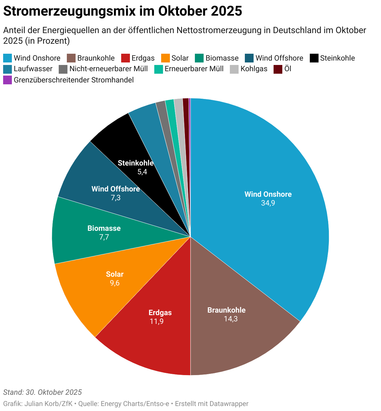 Anteil der Energiequellen an der öffentlichen Nettostromerzeugung in Deutschland im Oktober 2025 (in Prozent)