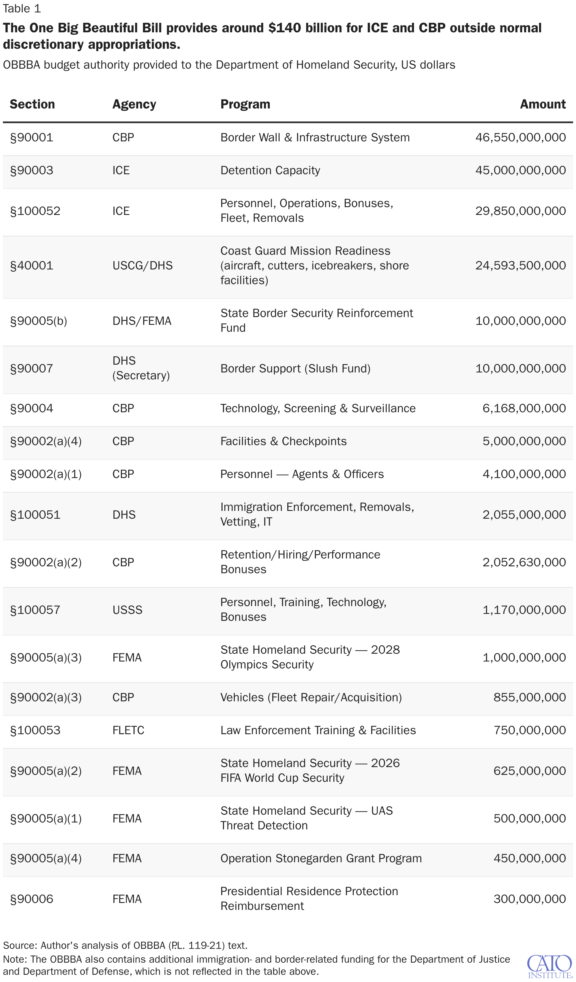 OBBBA budget authority provided to the Department of Homeland Security, US dollars
