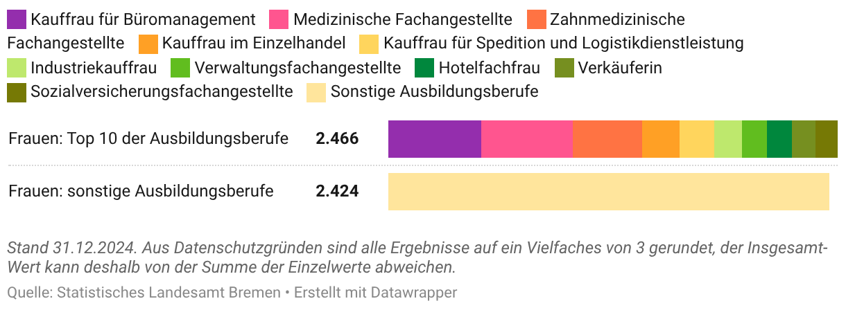 Das Balkendiagramm zeigt die 10 Ausbildungsberufe, die am häufigsten von Frauen im Land Bremen gewählt werden.