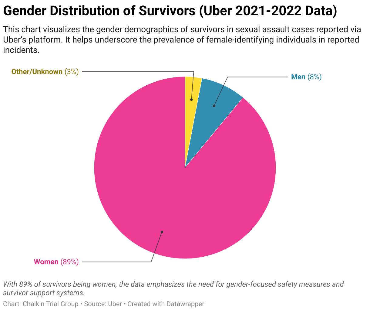 This chart visualizes the gender demographics of survivors in sexual assault cases reported via Uber’s platform. It helps underscore the prevalence of female-identifying individuals in reported incidents.