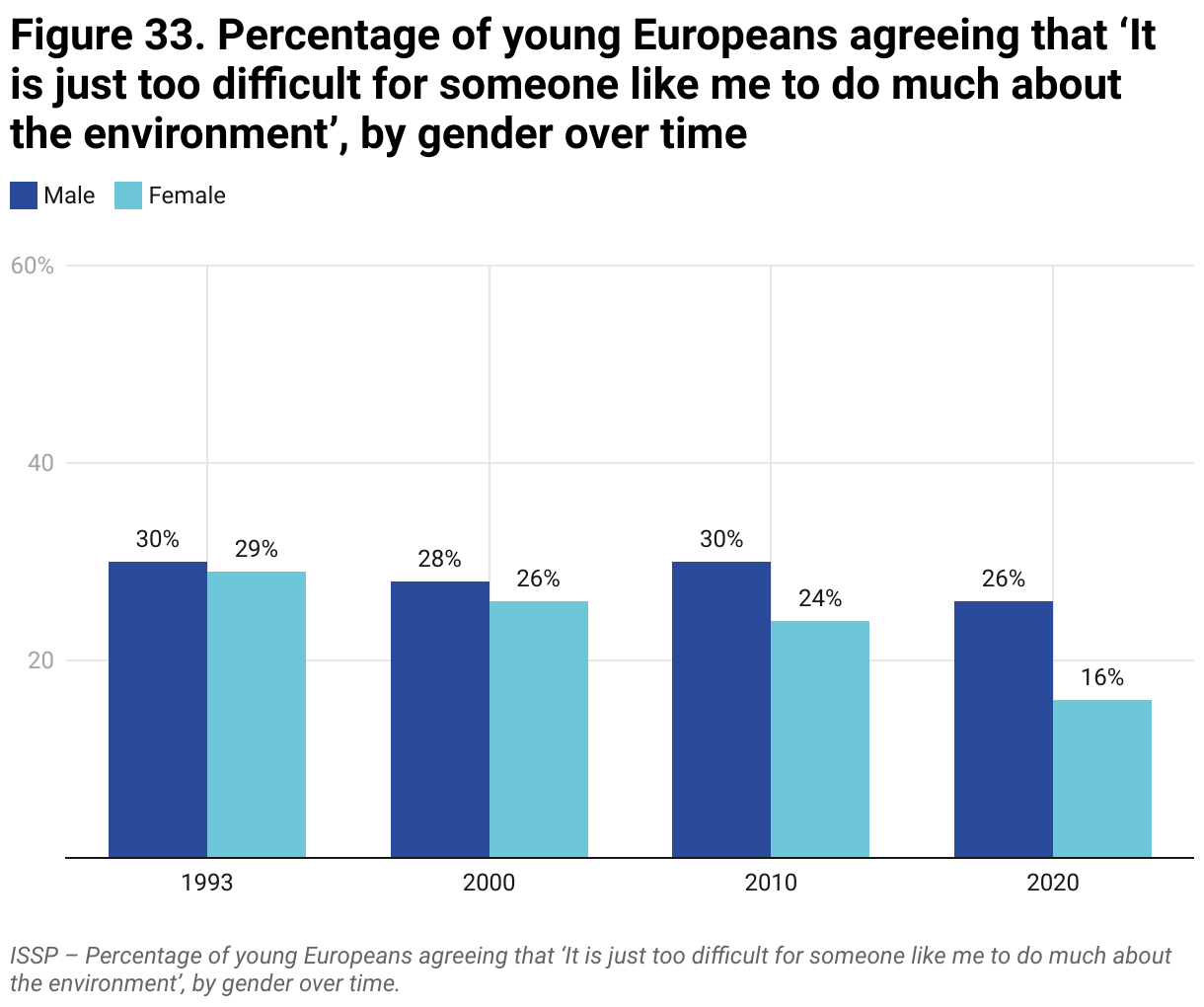 Figure 33: ISSP – Percentage of young Europeans agreeing that ‘It is just too difficult for someone like me to do much about the environment’, by gender over time.
