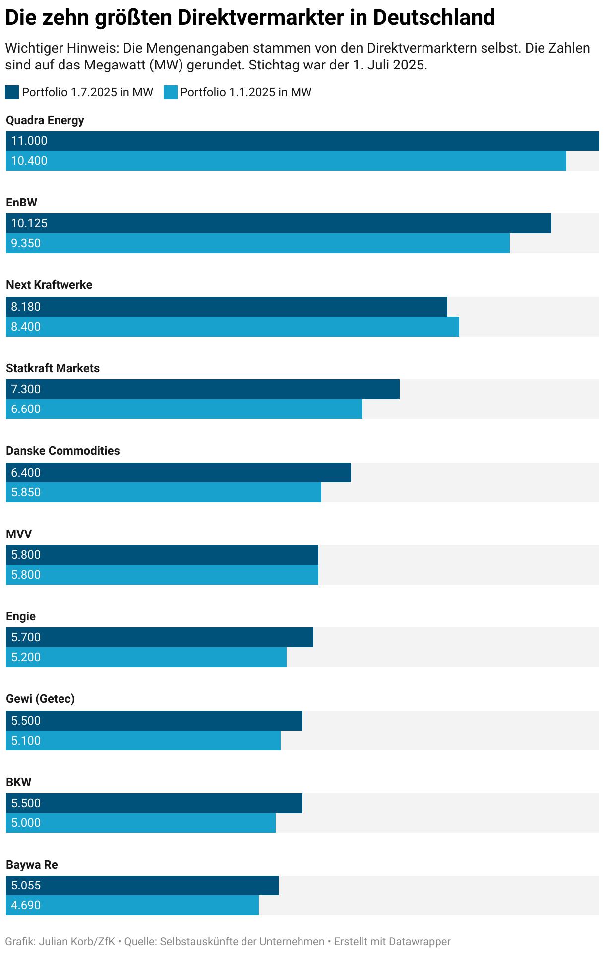 Wichtiger Hinweis: Die Mengenangaben stammen von den Direktvermarktern selbst. Die Zahlen sind auf das Megawatt (MW) gerundet. Stichtag war der 1. Juli 2025.