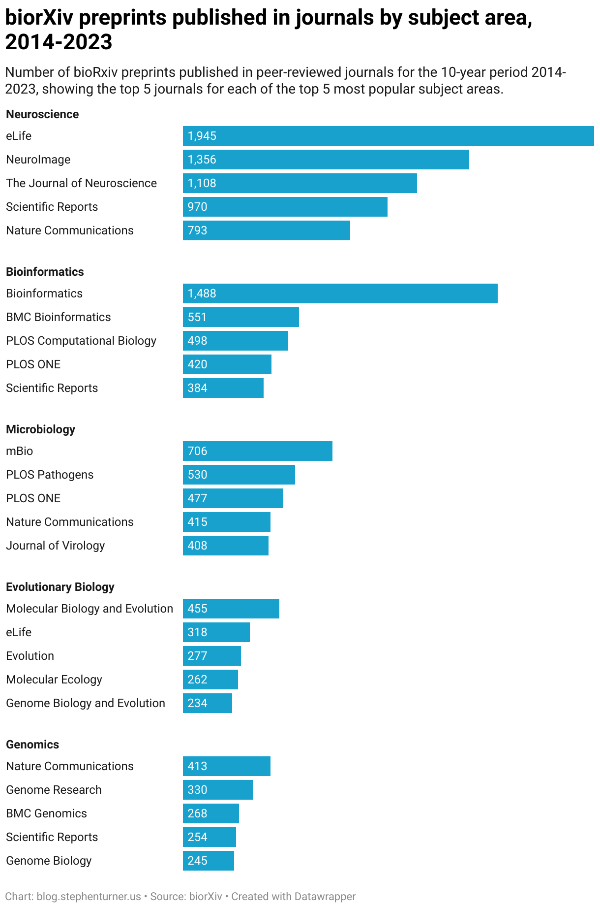 Number of bioRxiv preprints published in peer-reviewed journals for the 10-year period 2014-2023, showing the top 5 journals for each of the top 5 most popular subject areas.