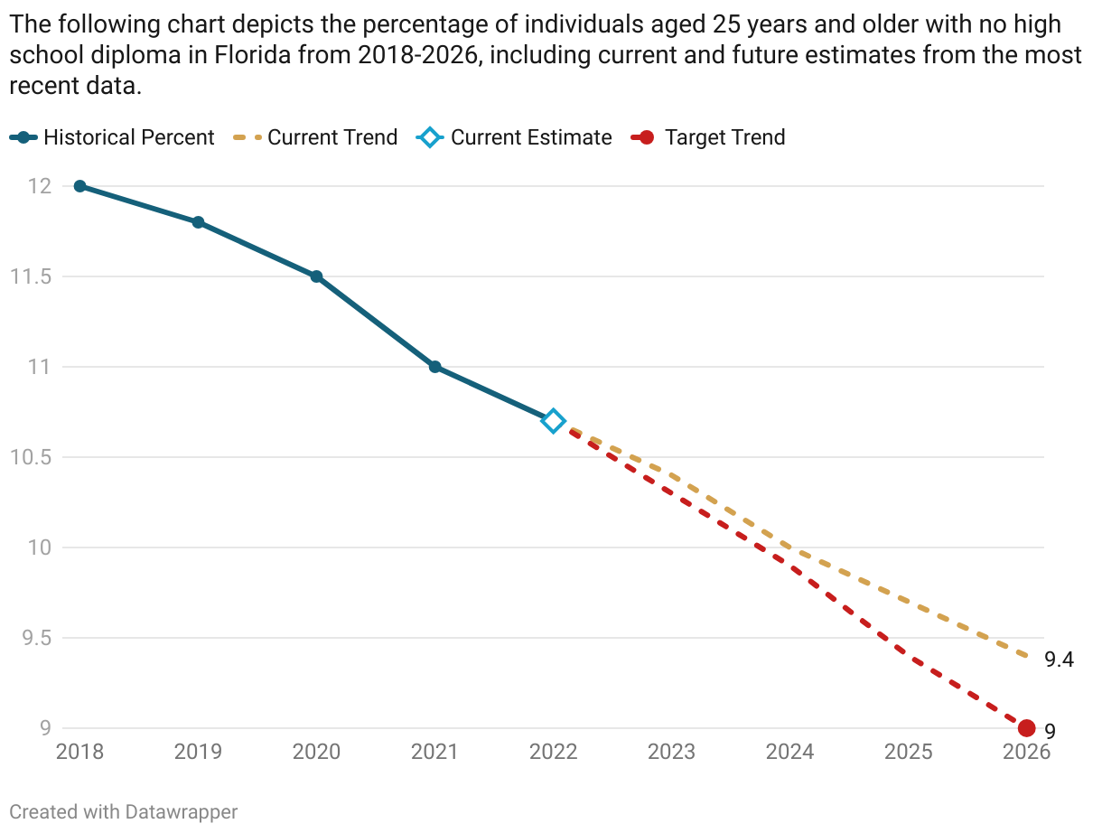 The following chart depicts the percentage of individuals aged 25 years and older with no high school diploma in Florida from 2018-2026, including current and future estimates from the most recent data.