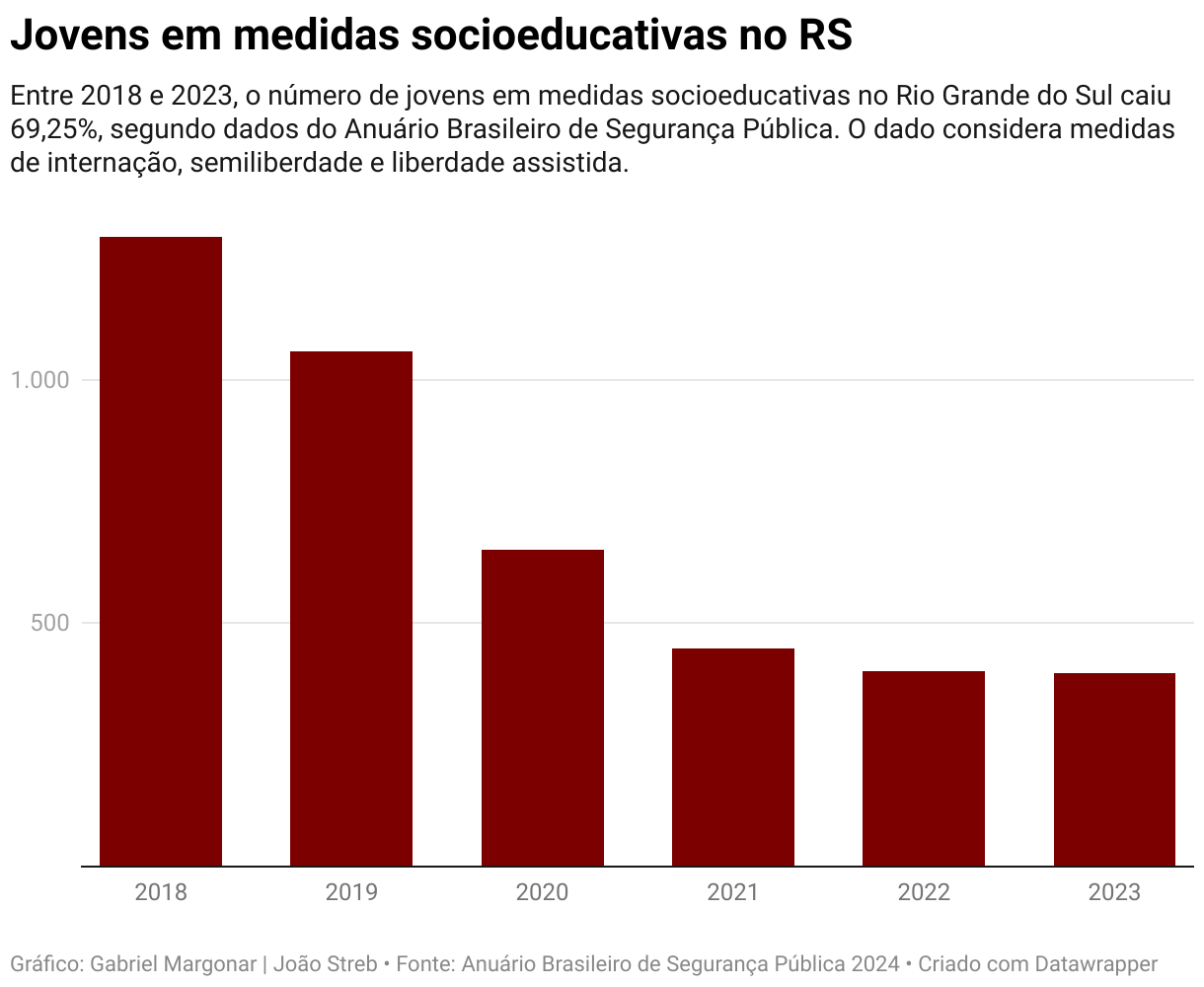 Entre 2018 e 2023, o número de jovens em medidas socioeducativas no Rio Grande do Sul caiu 69,25%, segundo dados do Anuário Brasileiro de Segurança Pública. O dado considera medidas de internação, semiliberdade e liberdade assistida.