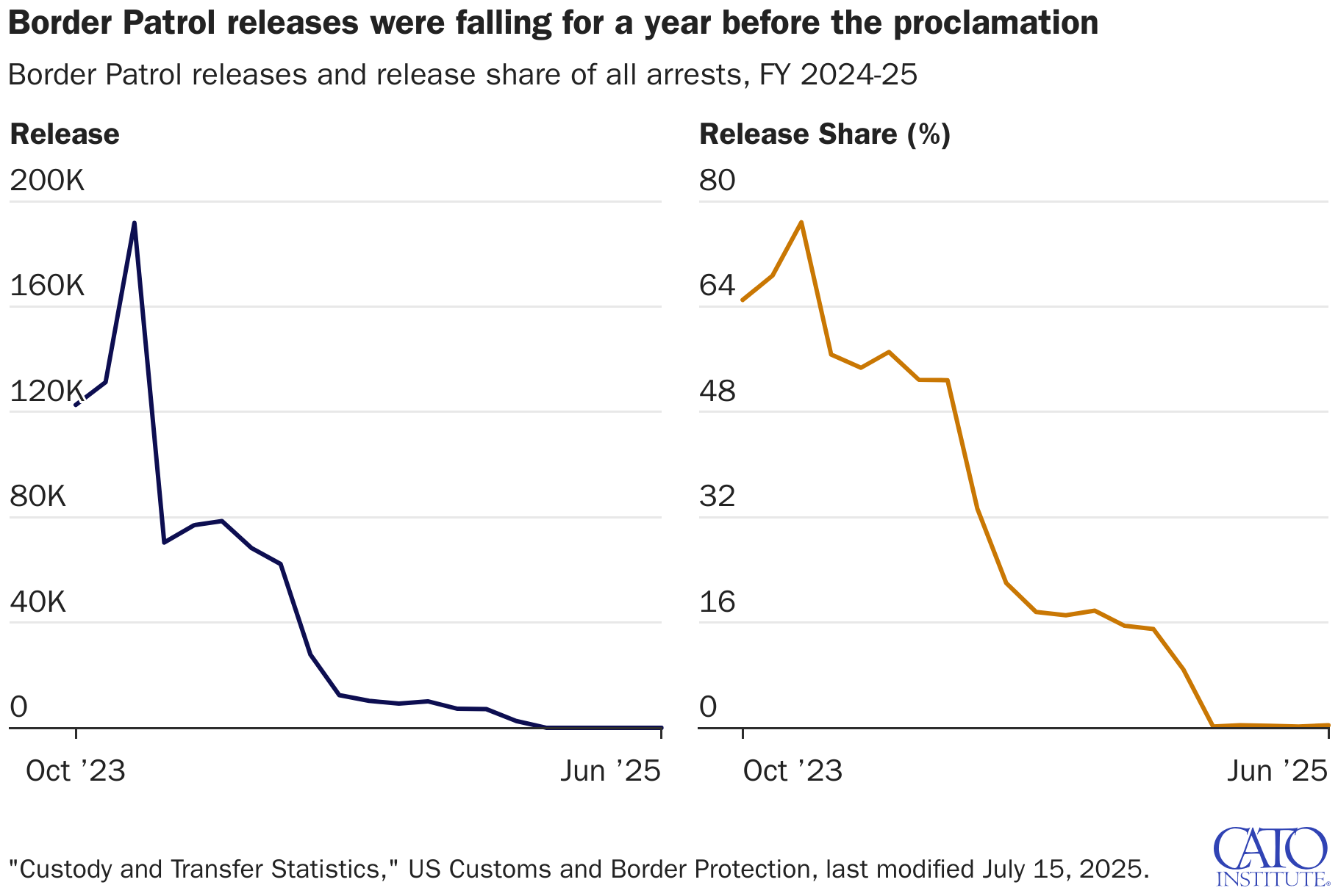 Border Patrol releases and release share of all arrests, FY 2024-25