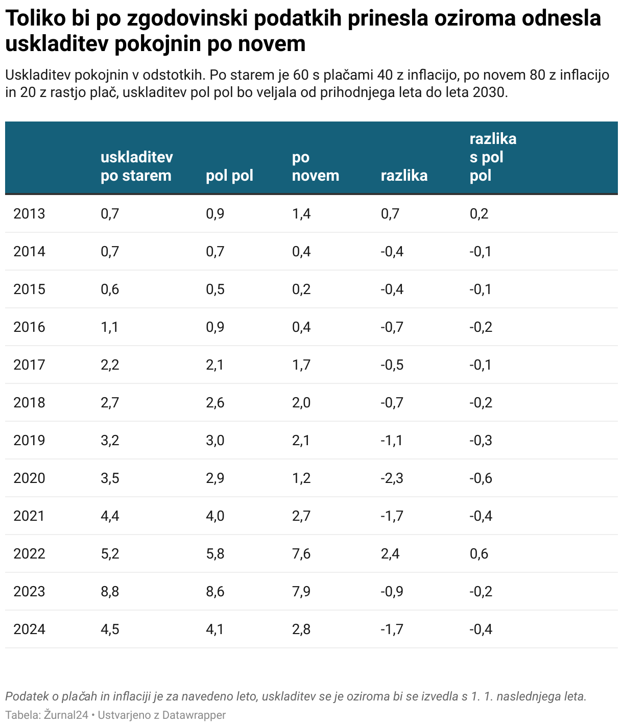 Uskladitev pokojnin v odstotkih. Po starem je 60 s plačami 40 z inflacijo, po novem 80 z inflacijo in 20 z rastjo plač, uskladitev pol pol bo veljala od prihodnjega leta do leta 2030.