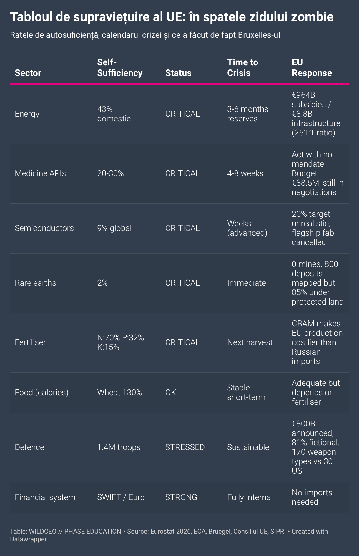 Interactive table presenting the EU Survival Scorecard, rating European strategic capabilities across energy, technology, defense, and pharmaceutical independence.