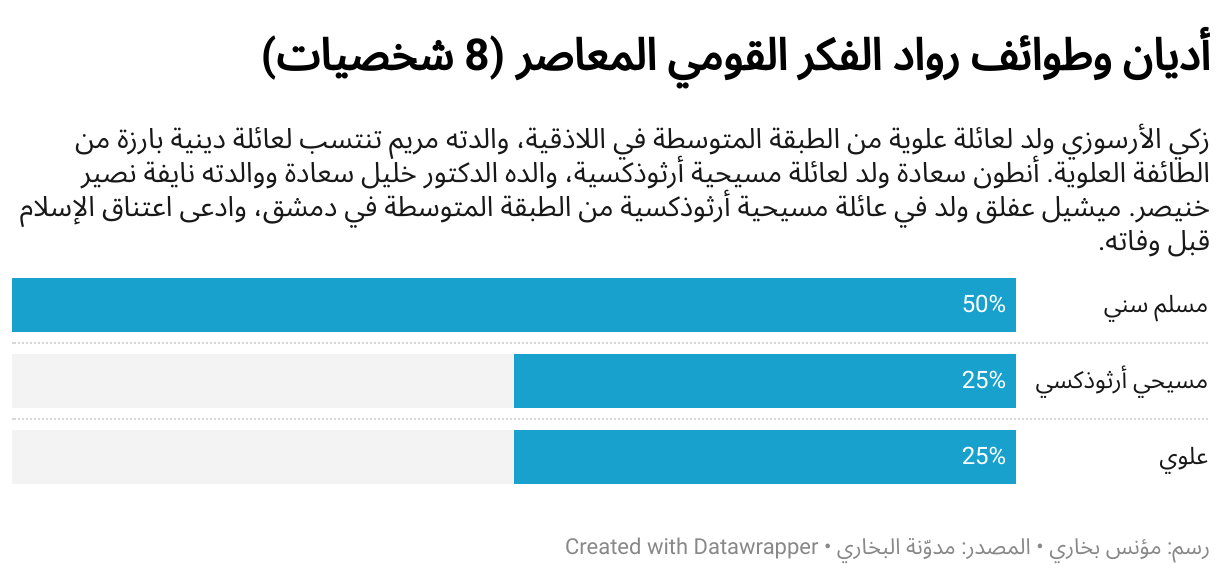 زكي الأرسوزي ولد لعائلة علوية من الطبقة المتوسطة في اللاذقية، والدته مريم تنتسب لعائلة دينية بارزة من الطائفة العلوية. أنطون سعادة ولد لعائلة مسيحية أرثوذكسية، والده الدكتور خليل سعادة ووالدته نايفة نصير خنيصر. ميشيل عفلق ولد في عائلة مسيحية أرثوذكسية من الطبقة المتوسطة في دمشق، وادعى اعتناق الإسلام قبل وفاته.
