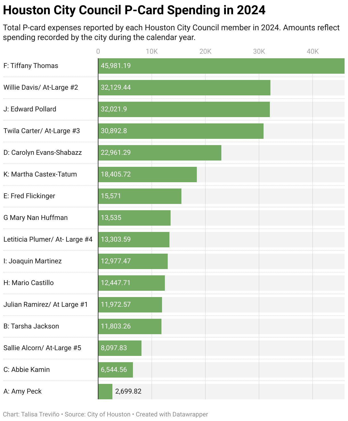Total P-card expenses reported by each Houston City Council member in 2024. Amounts reflect spending recorded by the city during the calendar year.