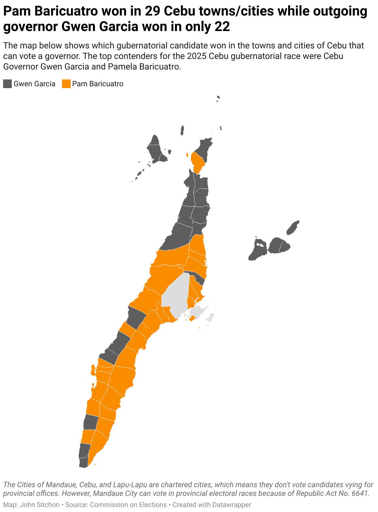 The map below shows which gubernatorial candidate won in the towns and cities of Cebu that can vote a governor. The top contenders for the 2025 Cebu gubernatorial race were Cebu Governor Gwen Garcia and Pamela Baricuatro.