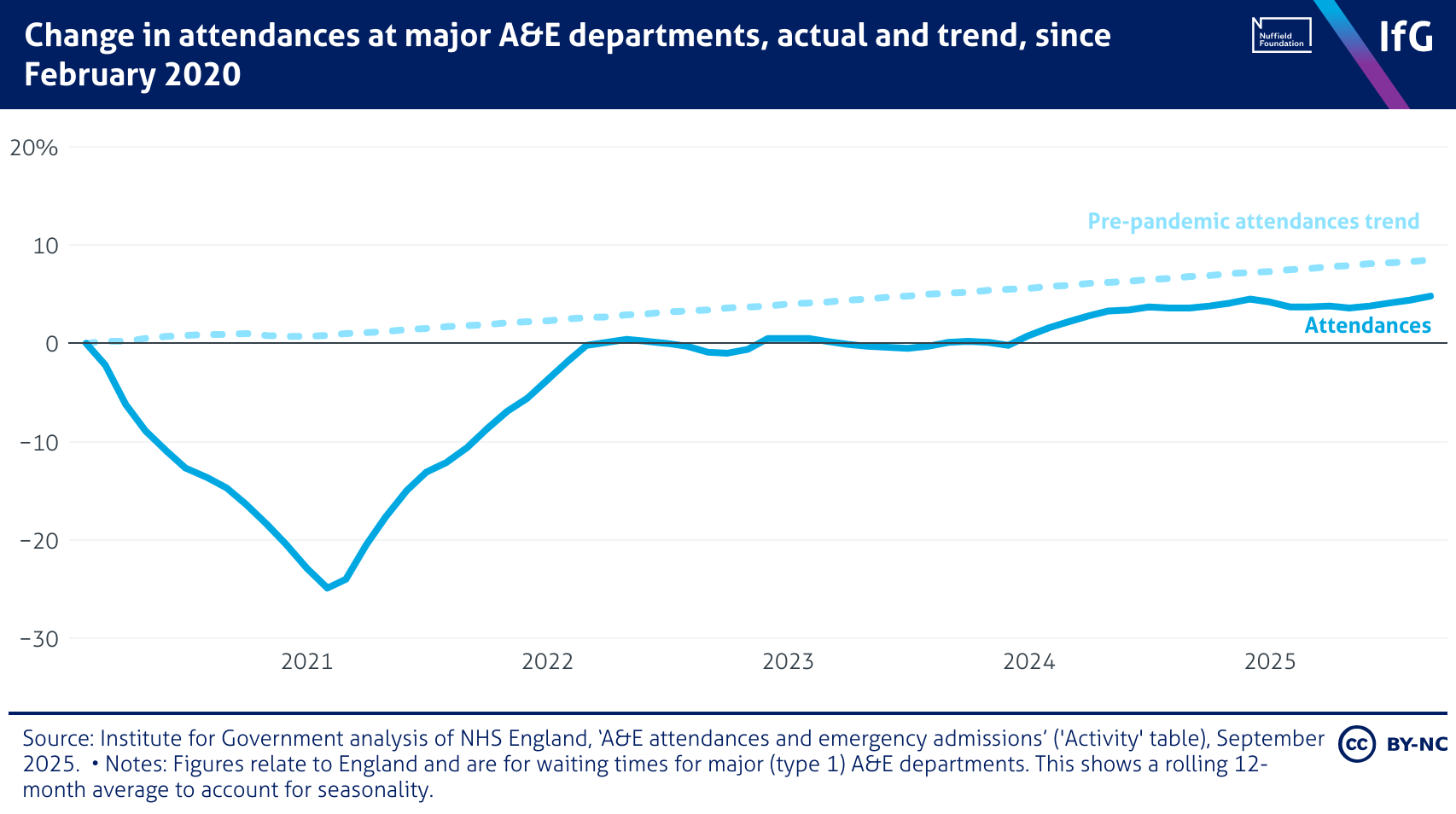 A line chart from the Institute for Government showing Change in attendances at major A&E departments, actual and trend, since February 2020. Attendances dropped sharply during the pandemic, falling 24.9% below pre-pandemic levels by early 2021, before recovering to around pre-pandemic levels by 2022. Since then, change in attendances has remained broadly flat, reaching 4.8% in September 2025, while the pre-pandemic trend indicates it would have grown by around 8.5% over the same time period.
