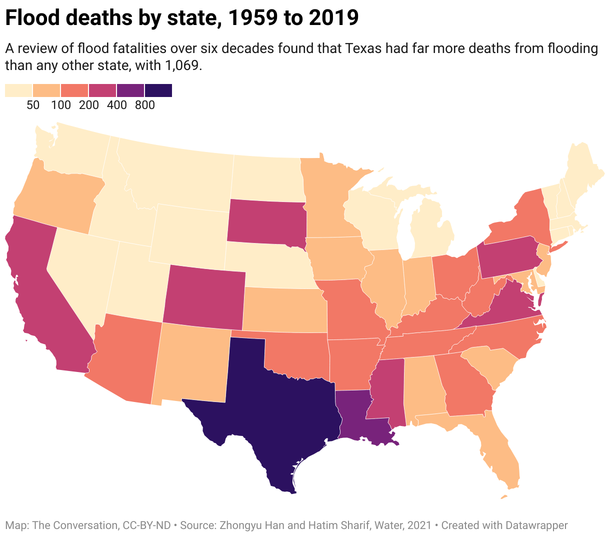 A map of the continental US shows Texas with the highest number of flood deaths at 1,069, followed by Louisiana at 693 and then California at 339. All the rest are under 300.