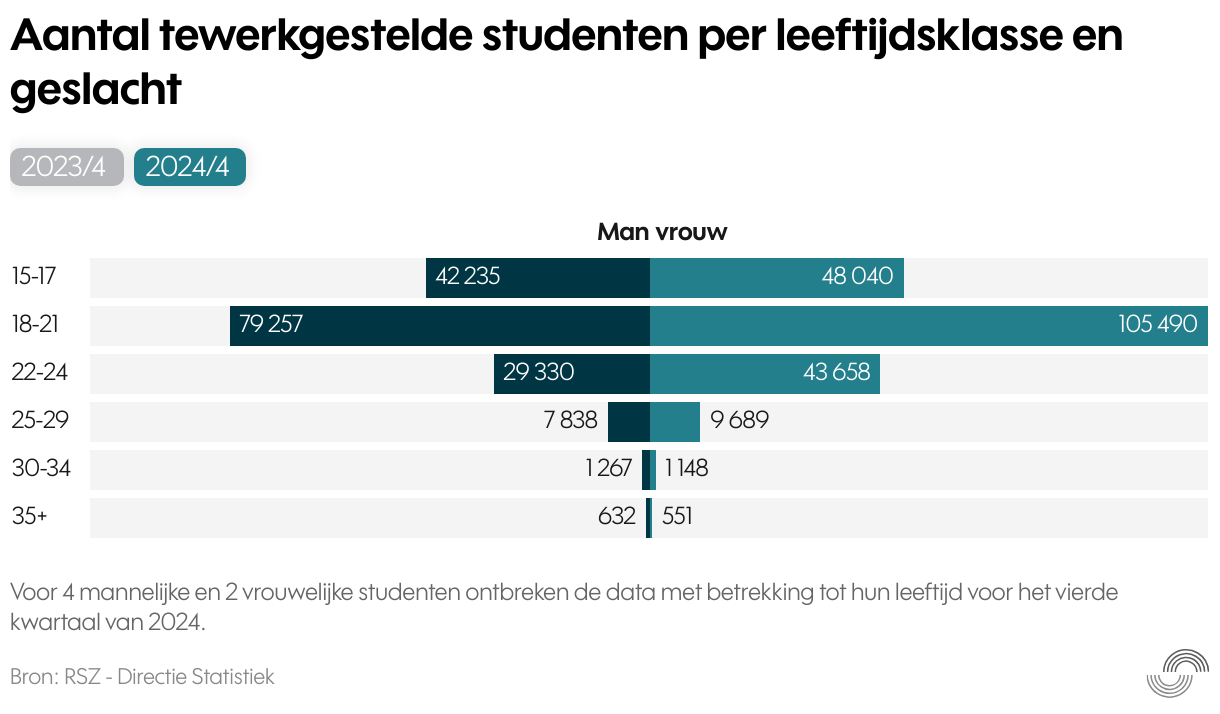 Aantal tewerkgestelde studenten per leeftijdsklasse en geslacht