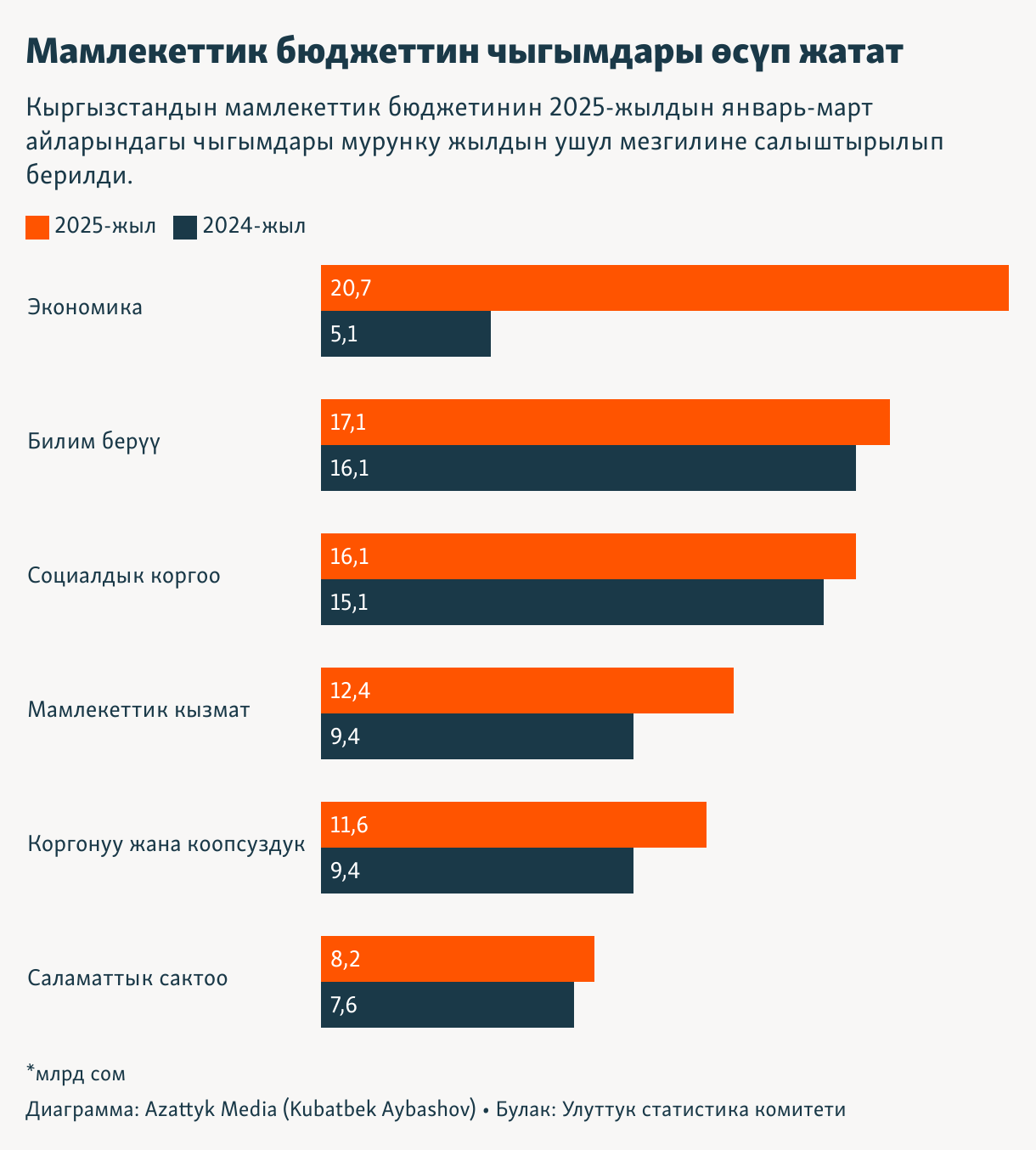 Кыргызстандын мамлекеттик бюджетинин 2025-жылдын январь-март айларындагы чыгымдары мурунку жылдын ушул мезгилине салыштырылып берилди.