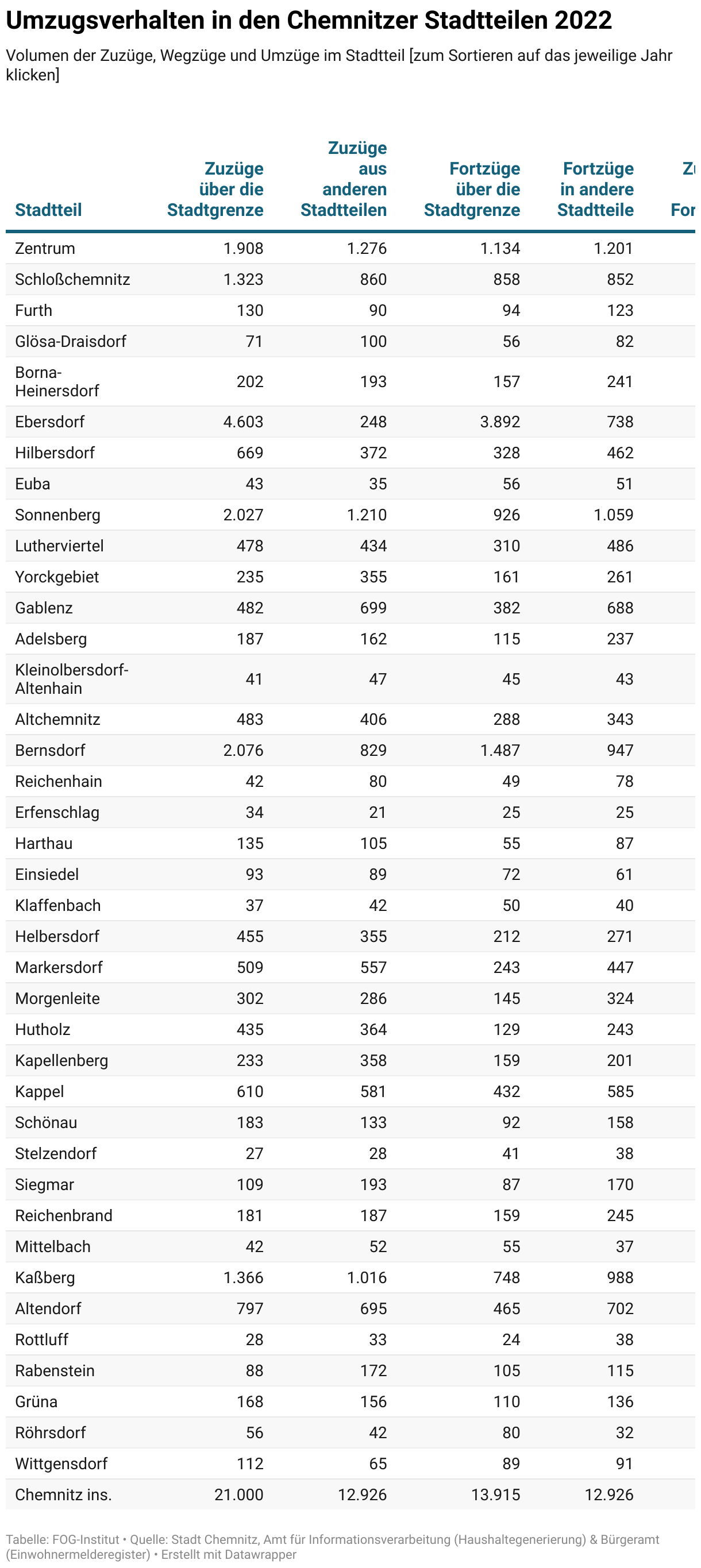 Volumen der Zuzüge, Wegzüge und Umzüge im Stadtteil [zum Sortieren auf das jeweilige Jahr klicken]