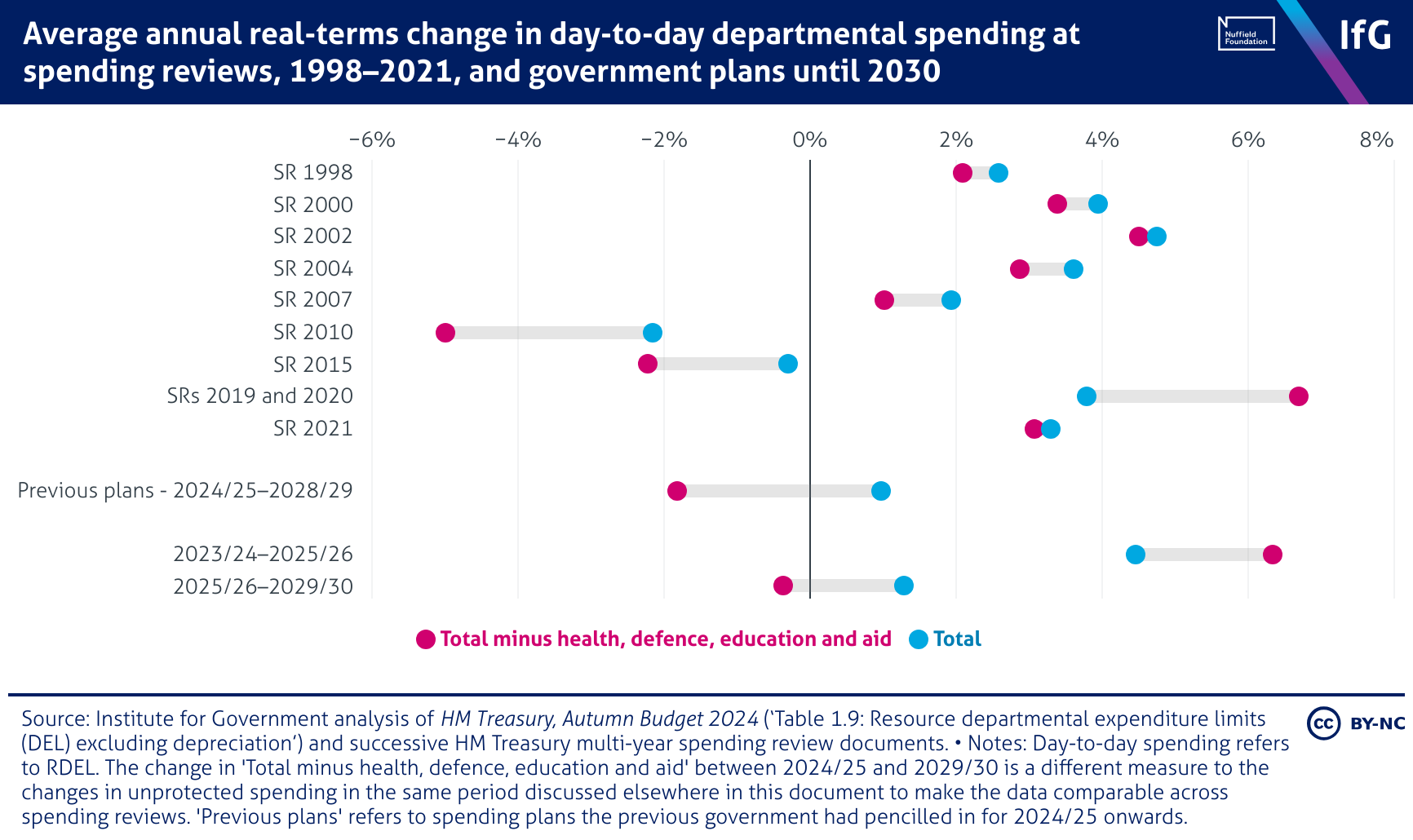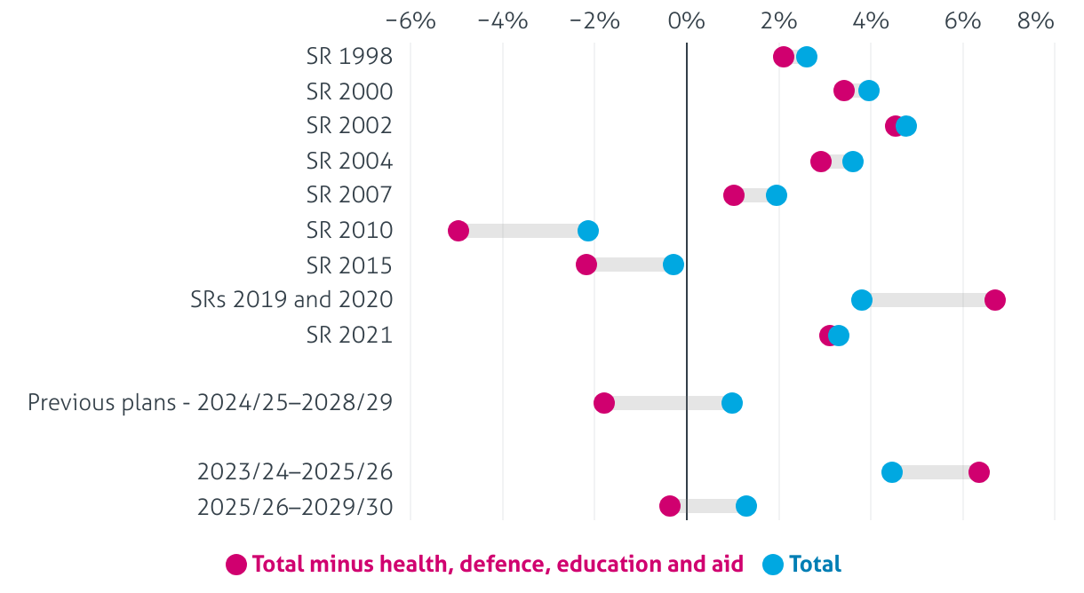 Average annual real-terms change in day-to-day departmental spending at spending reviews, 1998–2021, and government plans until 2030