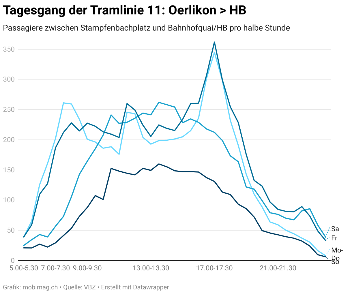 Passagiere zwischen Stampfenbachplatz und Bahnhofquai/HB pro halbe Stunde