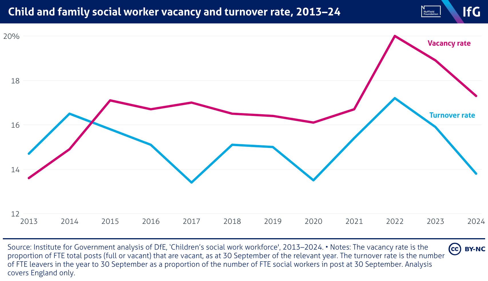 A line chart from the Institute for Government showing child and family social worker vacancy and turnover rate, 2013–24, where vacancy and turnover rates rose after 2020, peaking at 20% and 17.2% respectively in 2022. Since 2022, both have fallen back to levels roughly comparable to before the pandemic.
