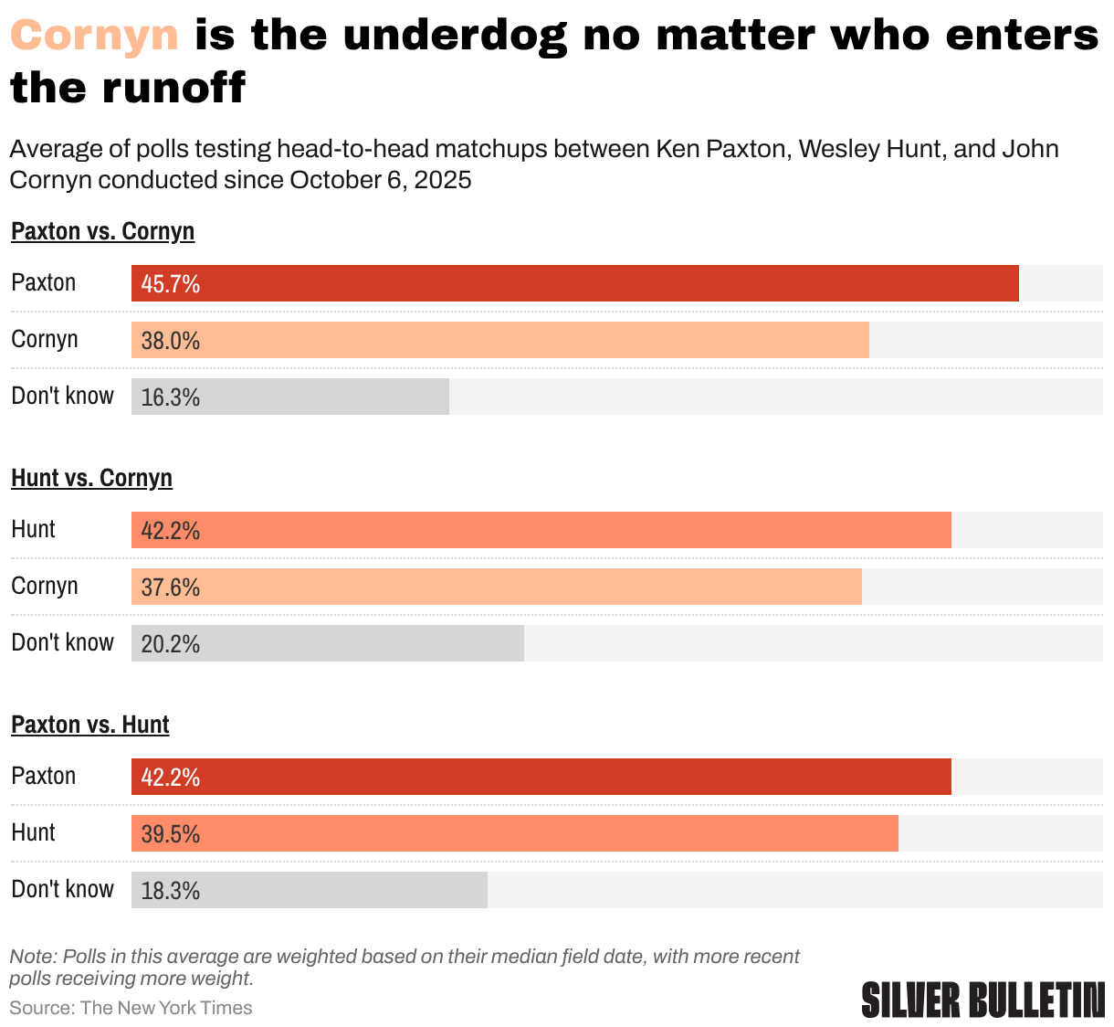 Average of polls testing head-to-head matchups between Ken Paxton, Wesley Hunt, and John Cornyn conducted since October 6, 2025