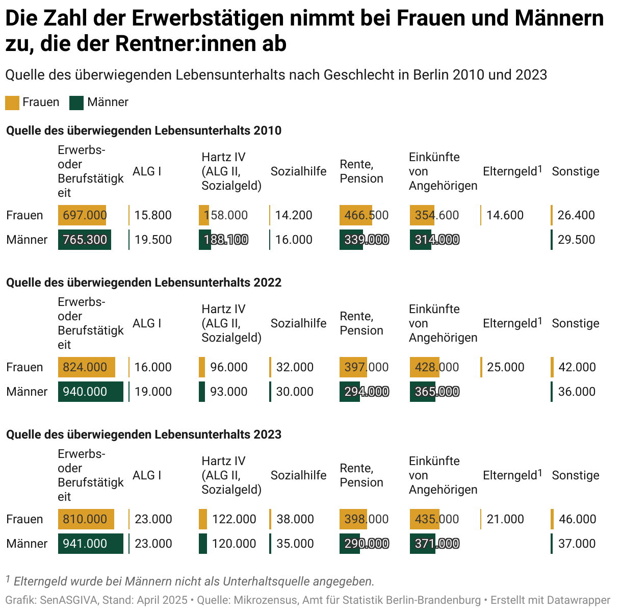 Im Vergleich zu 2010 bestritten im Jahr 2023 mehr Frauen und Männer ihren Haupt-Lebensunterhalt durch eine Erwerbs- oder Berufstätigkeit. Auch die Zahl der Personen, die durch ihre Angehörigen finanziert wurden, nahm bei beiden Geschlechtern zu. Die Zahlen derer, die sich hauptsächlich durch Renten bzw. Pensionen finanzieren sowie der Personen, die überwiegend von Hartz IV, ALG II und Sozialgeld leben, nahm hingegen ab.