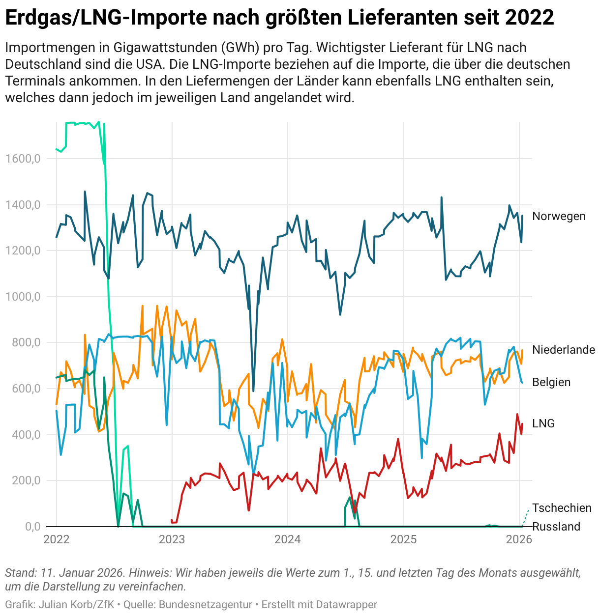 Importmengen in Gigawattstunden (GWh) pro Tag. Wichtigster Lieferant für LNG nach Deutschland sind die USA. Die LNG-Importe beziehen auf die Importe, die über die deutschen Terminals ankommen. In den Liefermengen der Länder kann ebenfalls LNG enthalten sein, welches dann jedoch im jeweiligen Land angelandet wird.