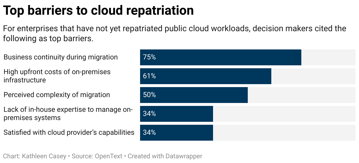 For enterprises that have not yet repatriated public cloud workloads, decision makers cited the following as top barriers.