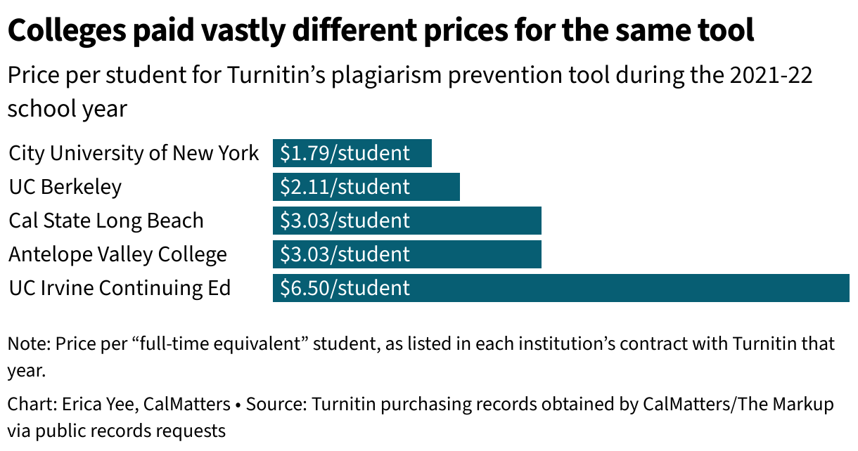 Bar chart comparing five schools by price per student for Turnitin’s plagiarism prevention tool during 2021-22. The lowest is City University of New York at $1.79; the highest is the UC Irvine Division of Continuing Education at $6.50.
