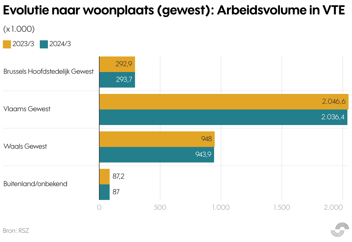 Evolutie naar woonplaats (gewest): Arbeidsvolume in VTE