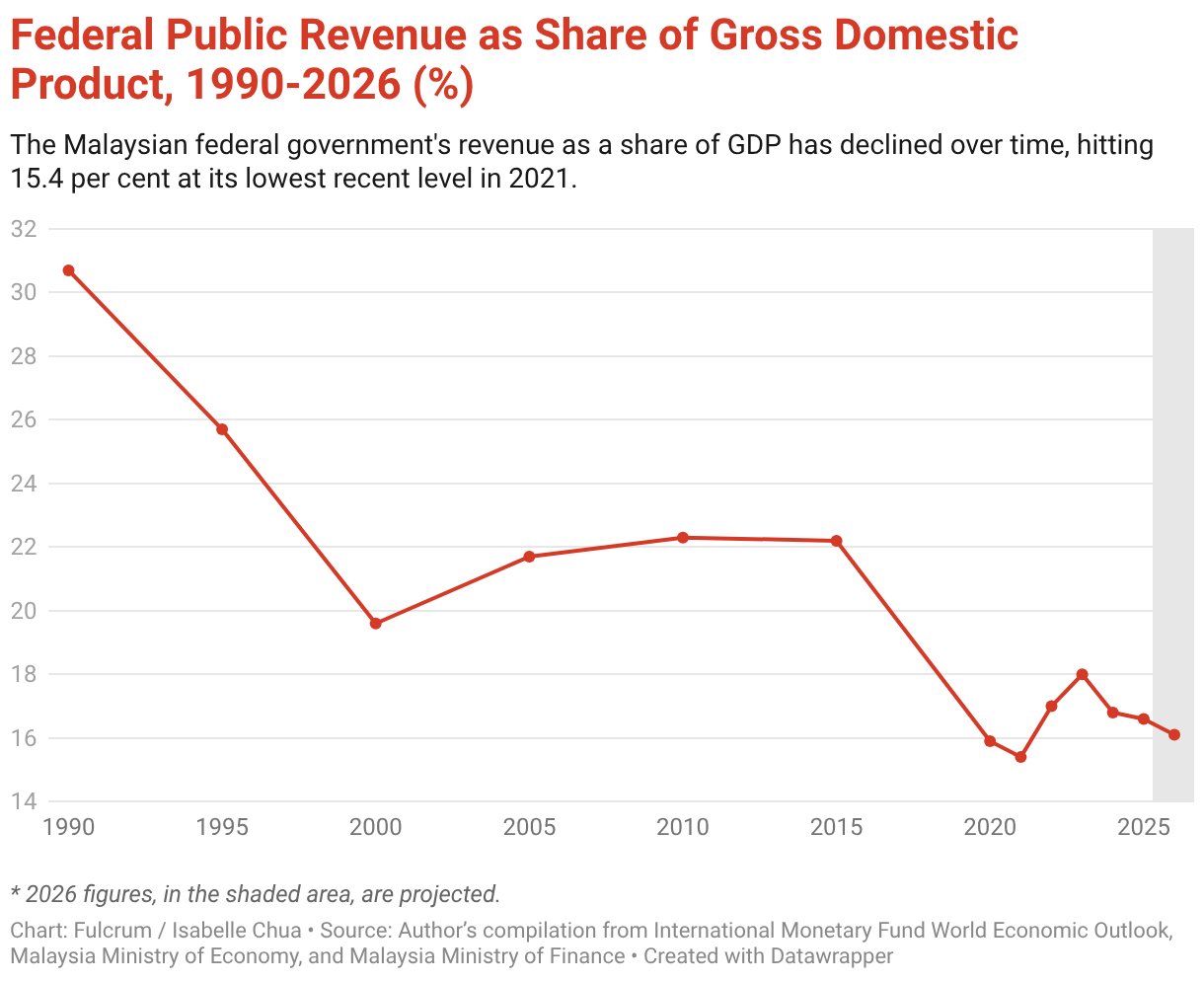 The Malaysian federal government's revenue as a share of GDP has declined over time, hitting 15.4 per cent at its lowest recent level in 2021.