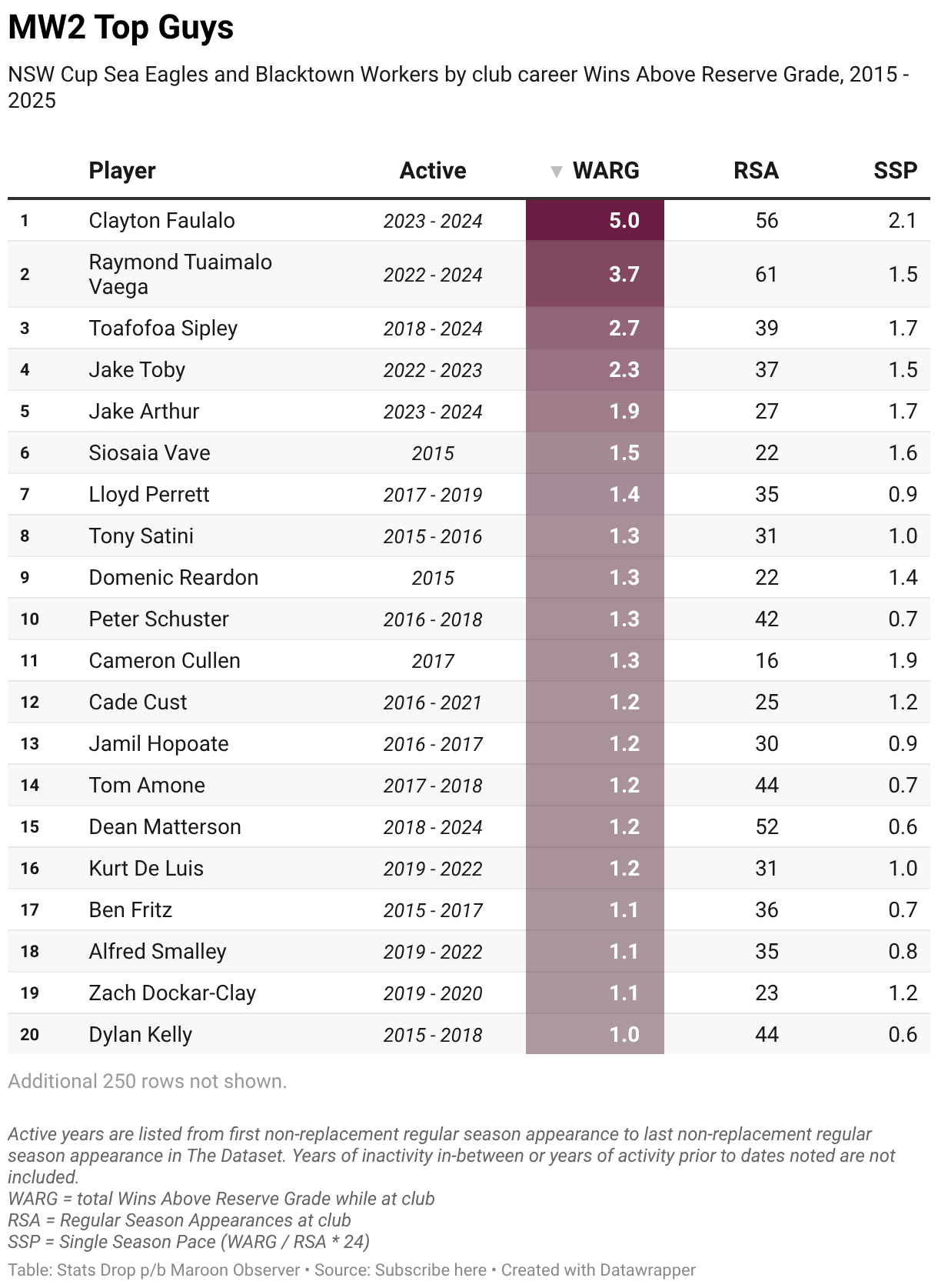 NSW Cup Sea Eagles and Blacktown Workers by club career Wins Above Reserve Grade, 2015 - 2025