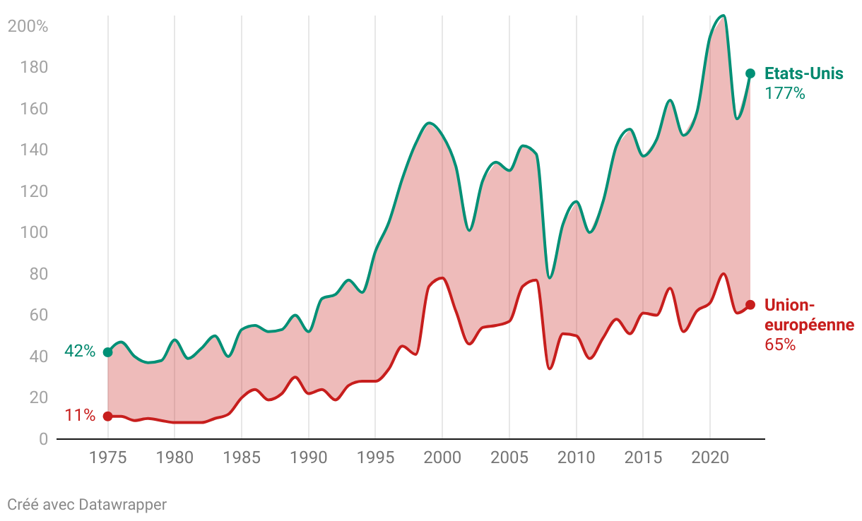 Dans l'Union européenne la capitalisation boursière représentait 65% du PIB en 2023, soit un déficit de 112% du PIB par rapport aux Etats-Unis ayant une capitalisation boursière représentant 177% du PIB.