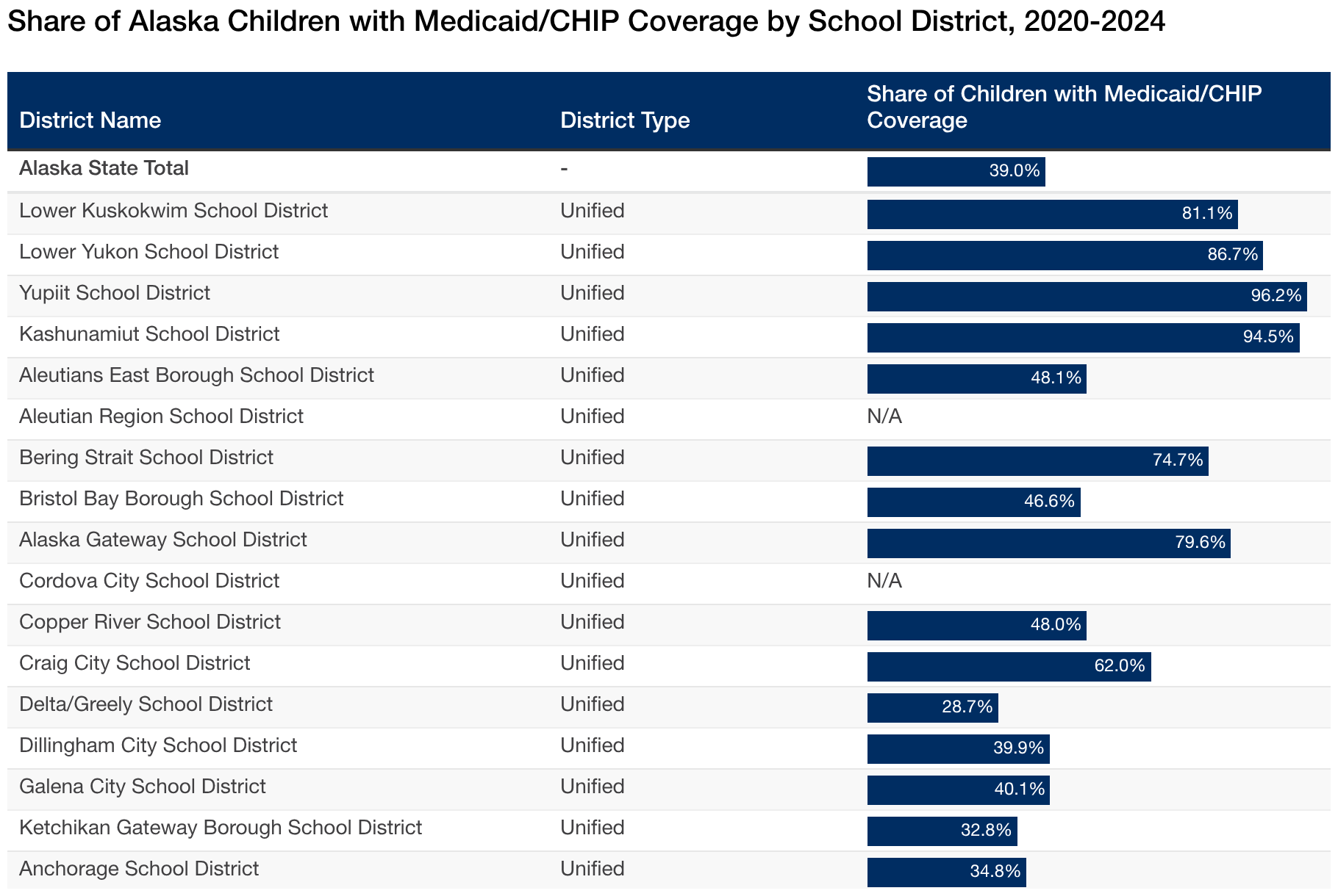 Share of Alaska Children with Medicaid/CHIP Coverage by School District, 2020-2024