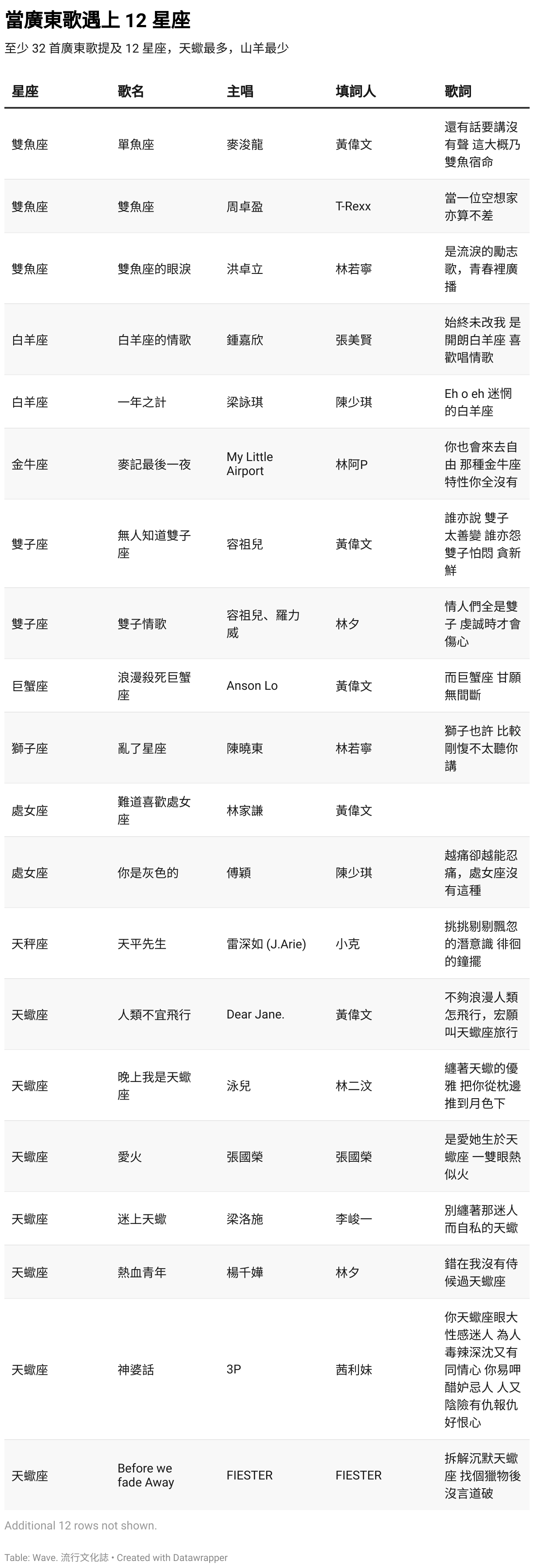 至少 32 首廣東歌提及 12 星座,天蠍最多,山羊最少