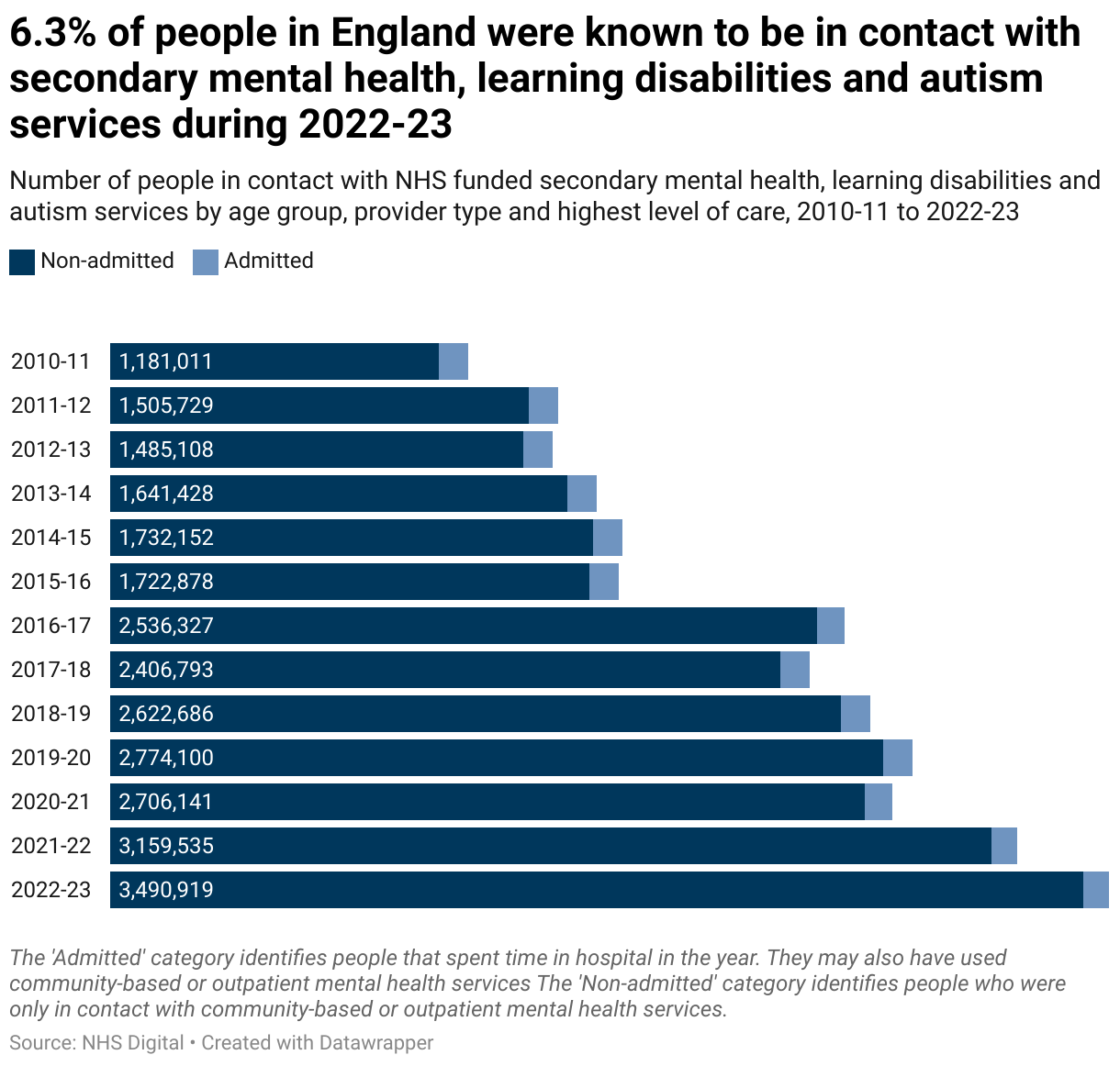 6.3% of people in England were known to be in contact with secondary mental health, learning disabilities and autism services during 2022-23