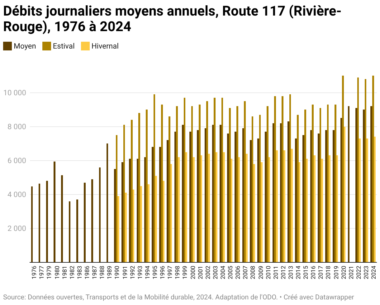 Débits journaliers moyens annuels, Route 117 (Rivière-Rouge), 1976 à 2024