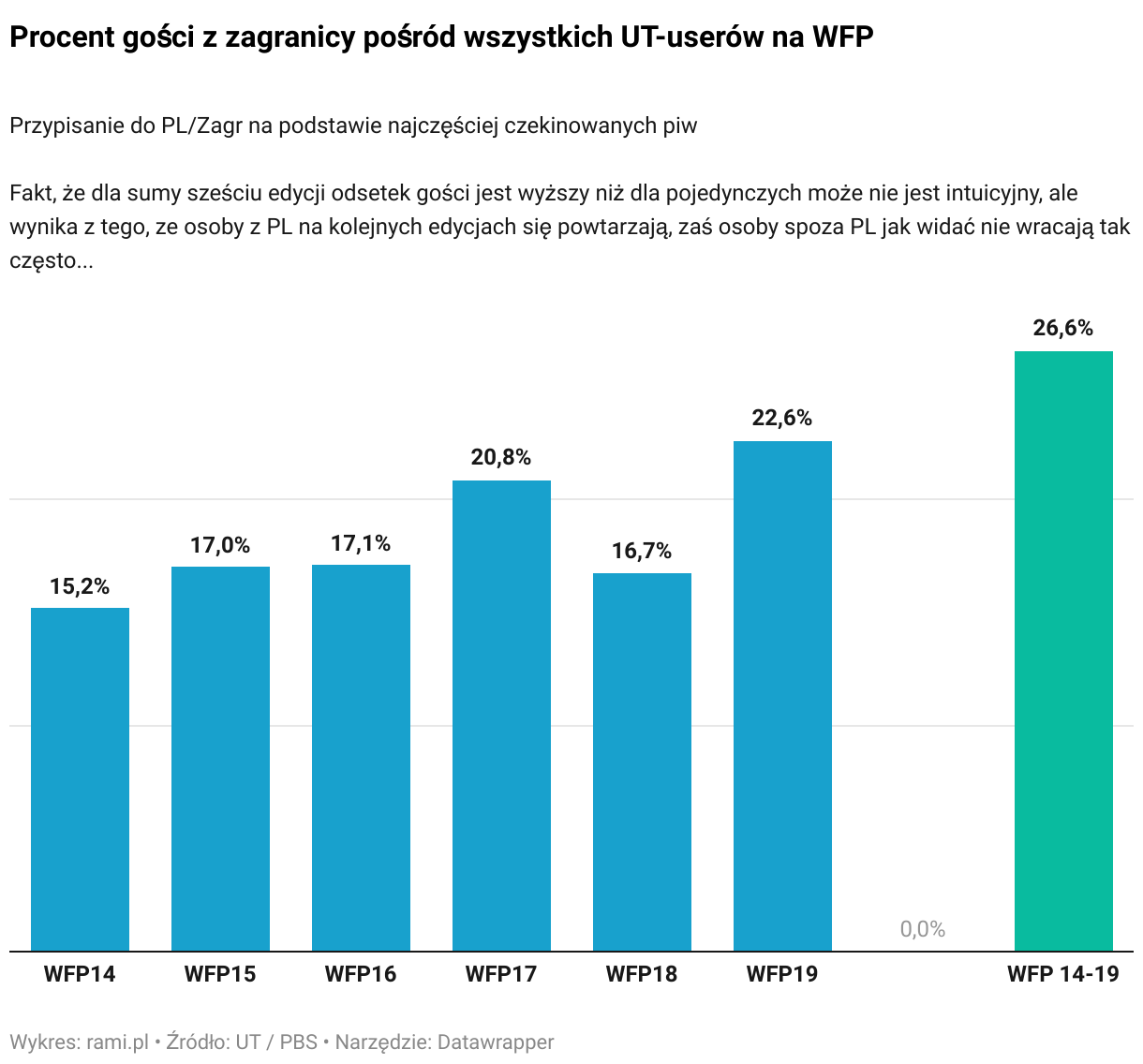 Fakt, że dla sumy sześciu edycji odsetek gości jest wyższy niż dla pojedynczych może nie jest intuicyjny, ale wynika z tego, ze osoby z PL na kolejnych edycjach się powtarzają, zaś osoby spoza PL jak widać nie wracają tak często...