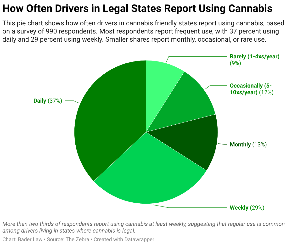 This pie chart shows how often drivers in cannabis friendly states report using cannabis, based on a survey of 990 respondents. Most respondents report frequent use, with 37 percent using daily and 29 percent using weekly. Smaller shares report monthly, occasional, or rare use.