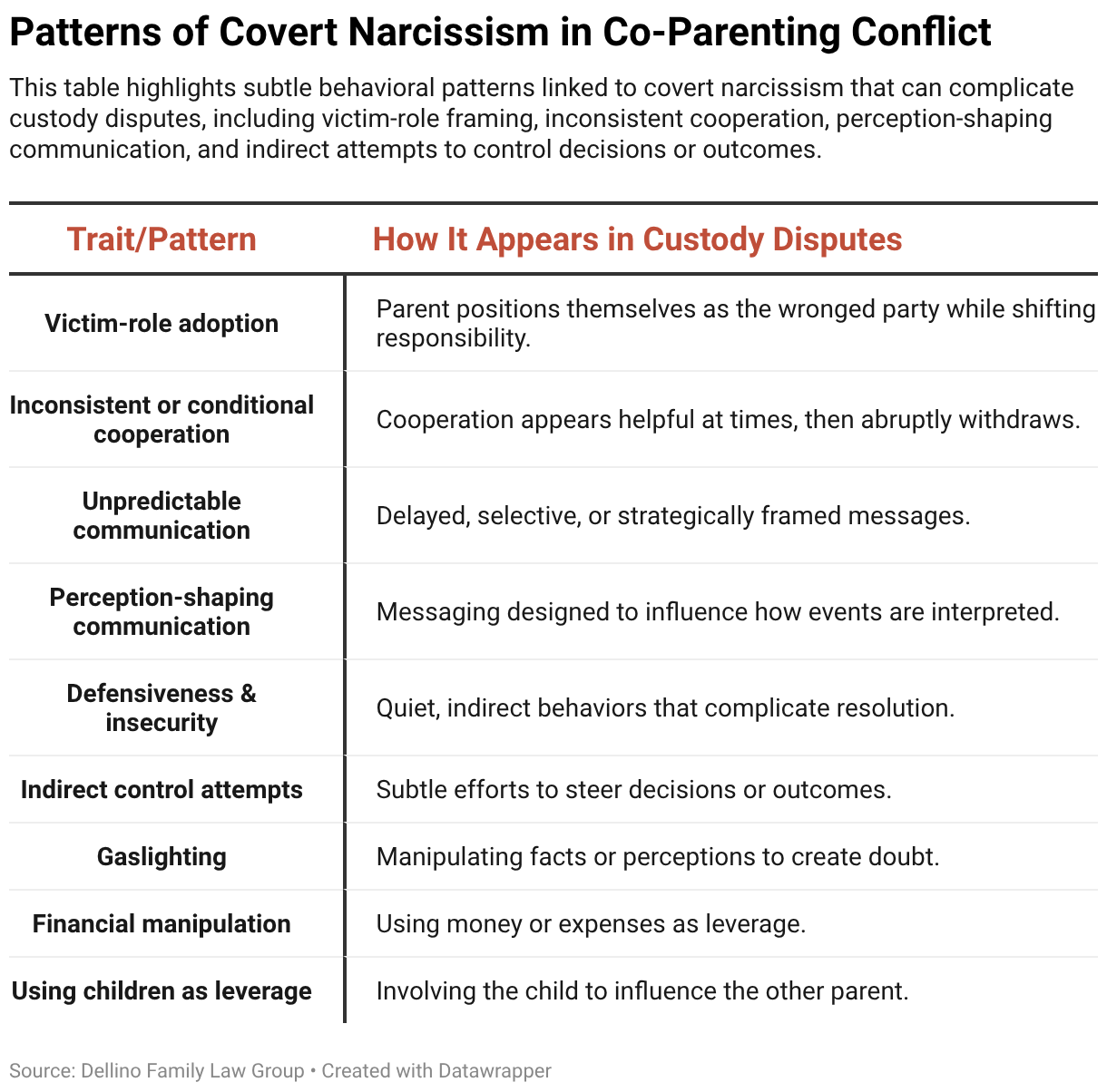 This table highlights subtle behavioral patterns linked to covert narcissism that can complicate custody disputes, including victim‑role framing, inconsistent cooperation, perception‑shaping communication, and indirect attempts to control decisions or outcomes.
