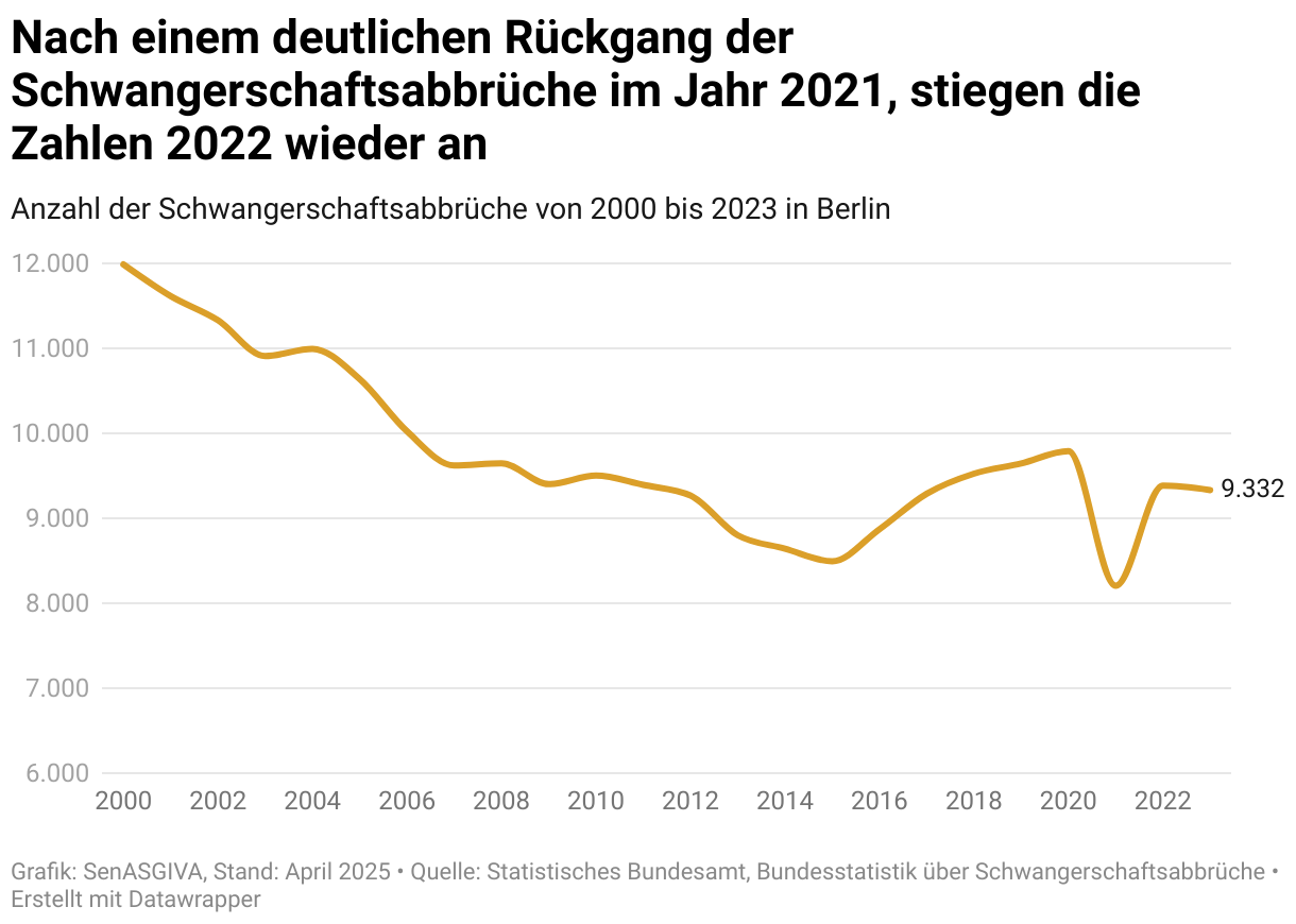 Von 2000 bis 2015 sank die Zahl der Schwangerschaftsabbrüche in Berlin. Von 2015 bis 2020 stiegen die Zahlen wieder an. Für das Jahr 2021 zeigt sich eine deutlicher Rückgang der Zahlen im Vergleich zu 2020 und 2022.