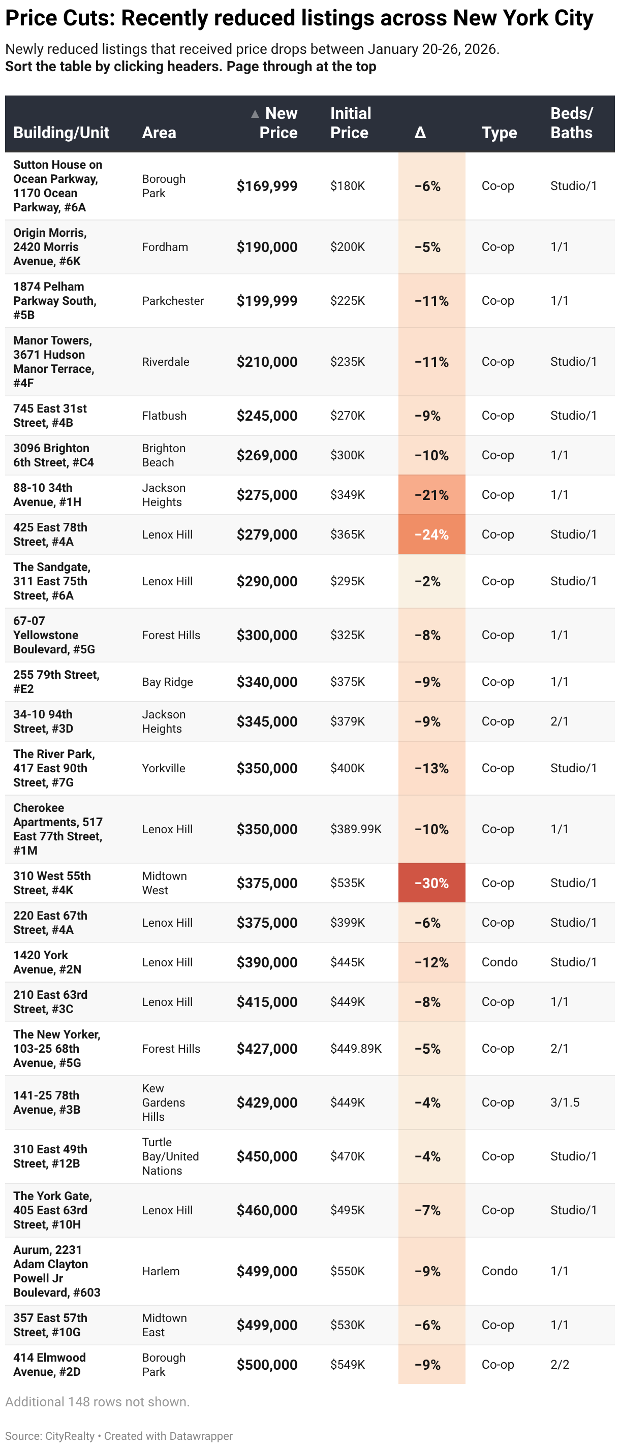 Newly reduced listings that received price drops between January 20-26, 2026. Sort the table by clicking headers. Page through at the top
