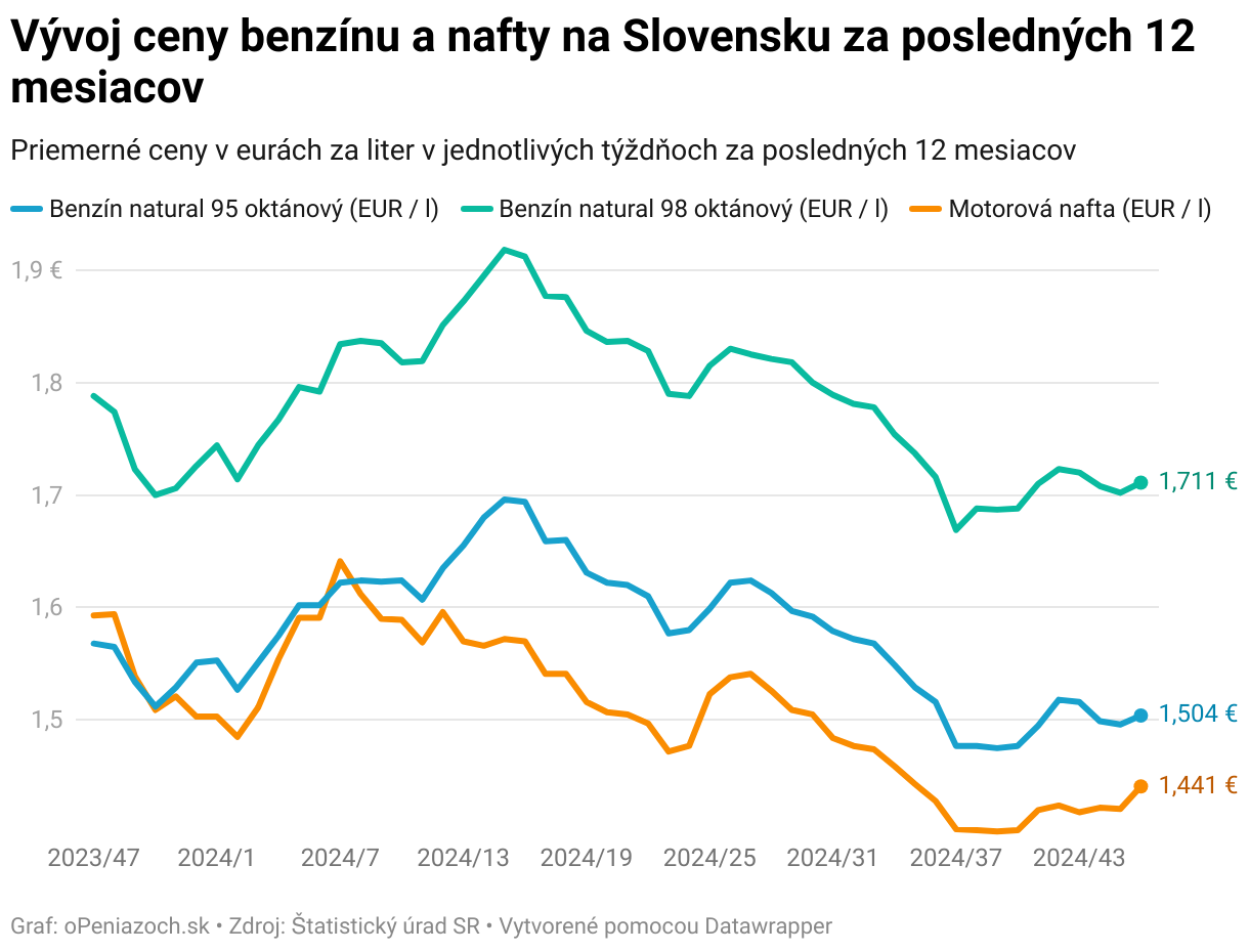Priemerné ceny v eurách za liter v jednotlivých týždňoch za posledných 12 mesiacov