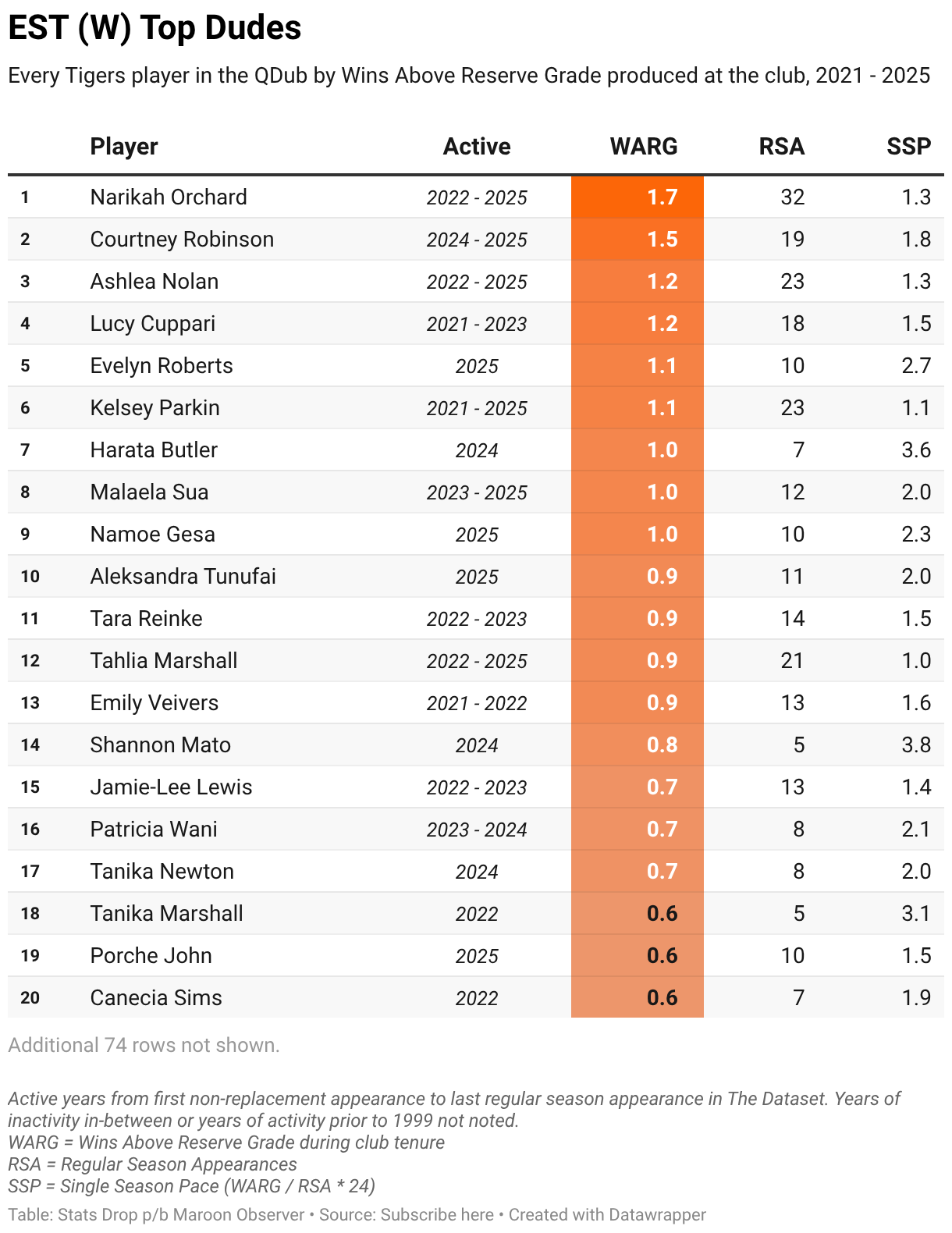 Every Tigers player in the QDub by Wins Above Reserve Grade produced at the club, 2021 - 2025