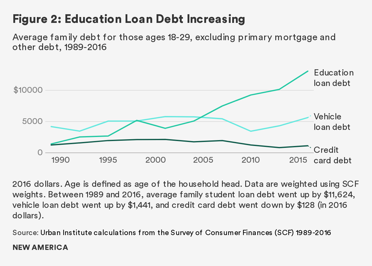 2016 dollars. Age is defined as age of the household head. Data are weighted using SCF weights. Between 1989 and 2016, average family student loan debt went up by $11,624, vehicle loan debt went up by $1,441, and credit card debt went down by $128 (in 2016 dollars).