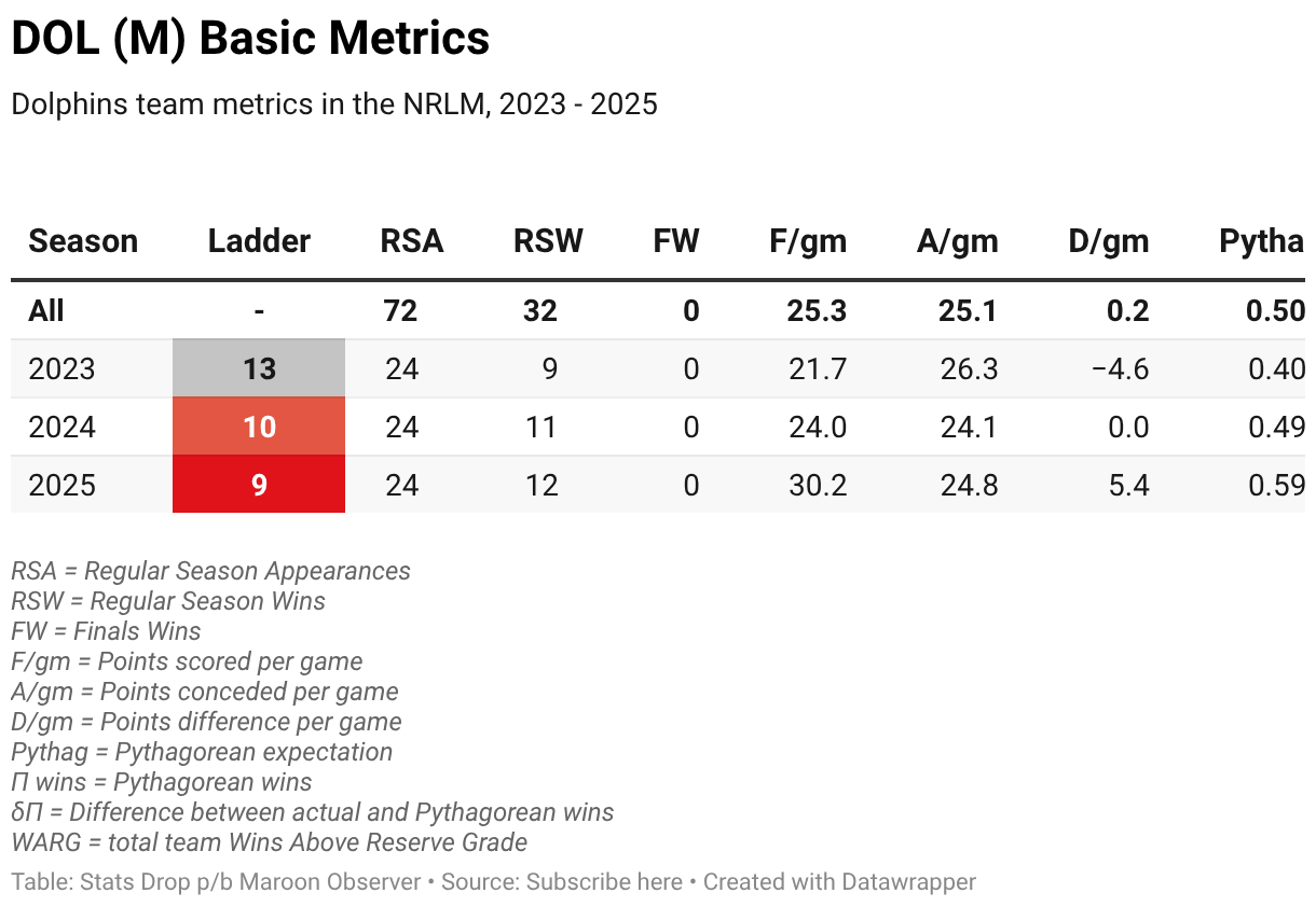 Dolphins team metrics in the NRLM, 2023 - 2025