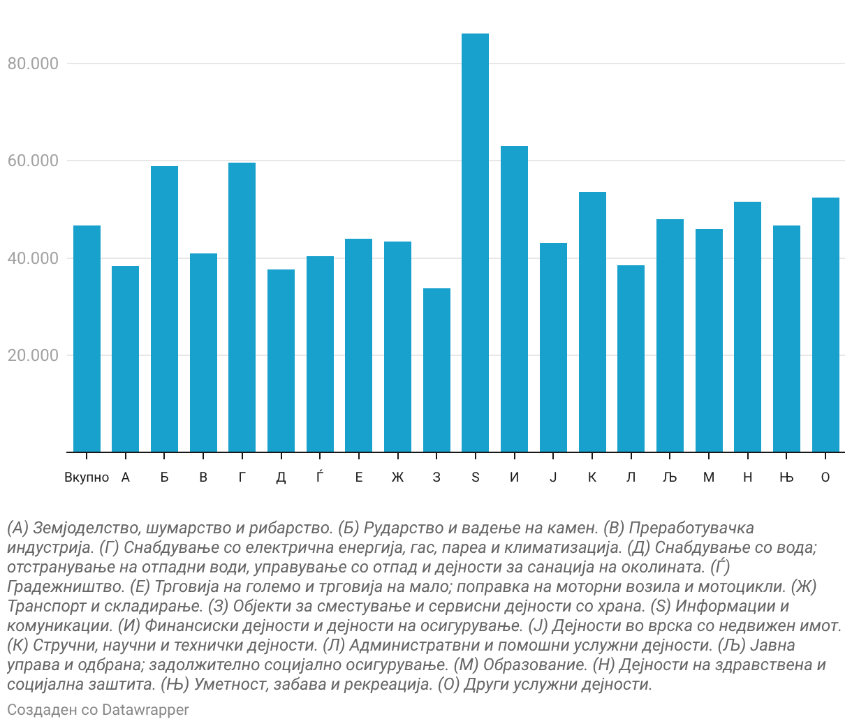 (А) Земјоделство, шумарство и рибарство. (Б) Рударство и вадење на камен. (В) Преработувачка индустрија. (Г) Снабдување со електрична енергија, гас, пареа и климатизација. (Д) Снабдување со вода; отстранување на отпадни води, управување со отпад и дејности за санација на околината. (Ѓ) Градежништво. (Е) Трговија на големо и трговија на мало; поправка на моторни возила и мотоцикли. (Ж) Транспорт и складирање. (З) Објекти за сместување и сервисни дејности со храна. (Ѕ) Информации и комуникации. (И) Финансиски дејности и дејности на осигурување. (Ј) Дејности во врска со недвижен имот. (К) Стручни, научни и технички дејности. (Л) Администратвни и помошни услужни дејности. (Љ) Јавна управа и одбрана; задолжително социјално осигурување. (М) Образование. (Н) Дејности на здравствена и социјална заштита. (Њ) Уметност, забава и рекреација. (О) Други услужни дејности.