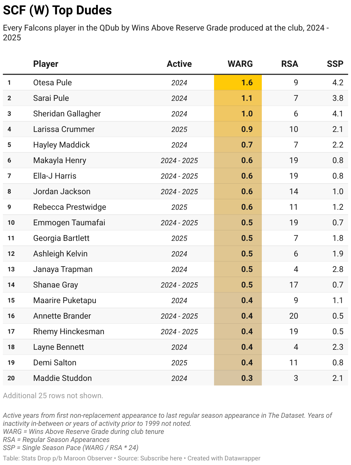 Every Falcons player in the QDub by Wins Above Reserve Grade produced at the club, 2024 - 2025